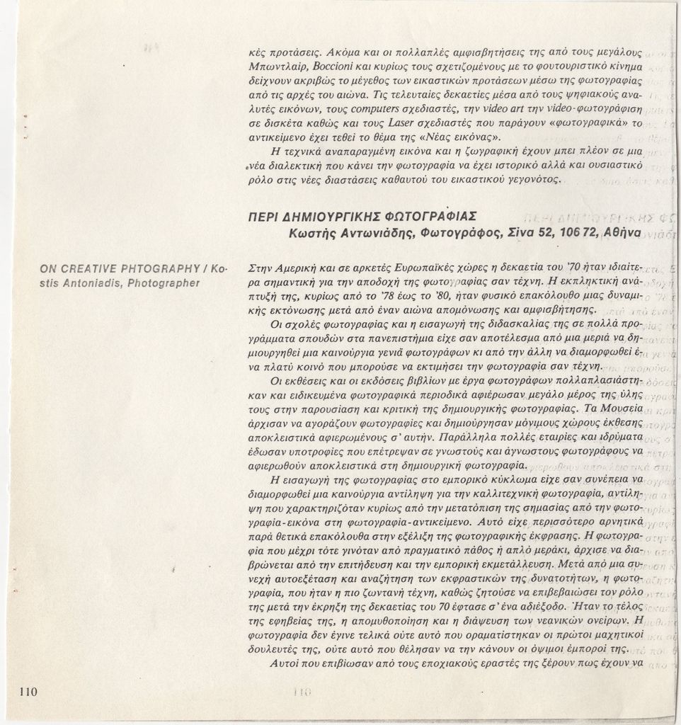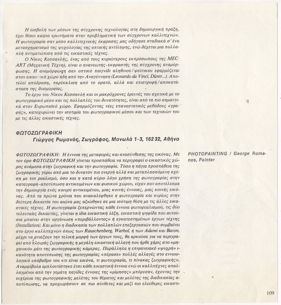 Φωτοαντίγραφο, χαρτί, 2 φφ, 21×16,5 εκ., στα ελληνικά, με κείμενο του Γιώργου Ρωμανού με τίτλο “Φωτοζωγραφική”, με το οποίο συμμετείχε σε Πανελλήνιο Συνέδριο Φωτογραφίας που διοργανώνεται από το Αριστοτέλειο Πανεπιστήμιο Θεσσαλονίκης.