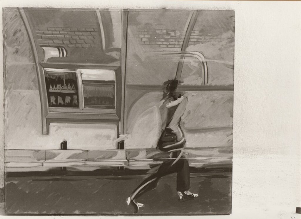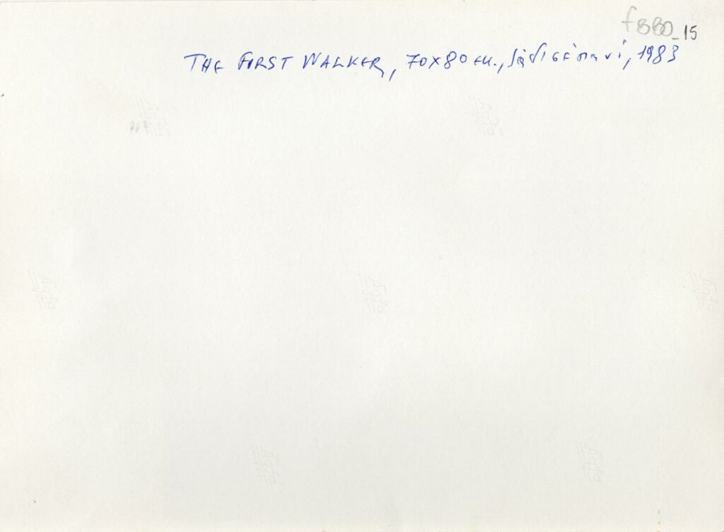 "The first walker", 70x80 εκ., λάδι σε πανί, 1983 (στην πίσω όψη, χειρόγραφη, με μπλε μελάνι, στα αγγλικά και ελληνικά)