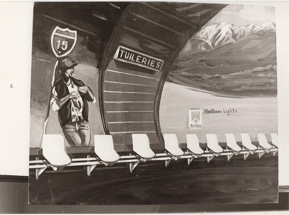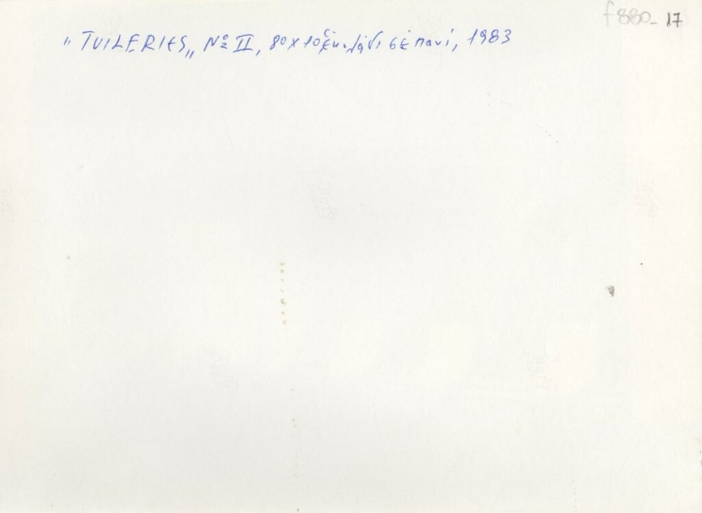 "Tuileries, No II", 80x10 εκ., λάδι σε πανί, 1983 (στην πίσω όψη, χειρόγραφη με μπλε μελάνι, στα γαλλικά και ελληνικά)