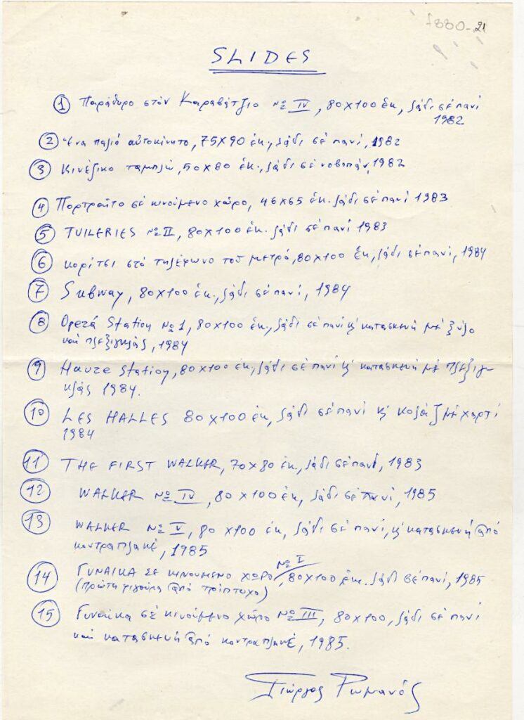 Κείμενο, με μπλε μελάνι, χαρτί, στα ελληνικά. Ιδιόγραφος κατάλογος φωτογραφιών έργων σε διαφάνειες (slides) του Γιώργου Ρωμανού, που απέστειλε ο καλλιτέχνης στον Τώνη Σπητέρη.