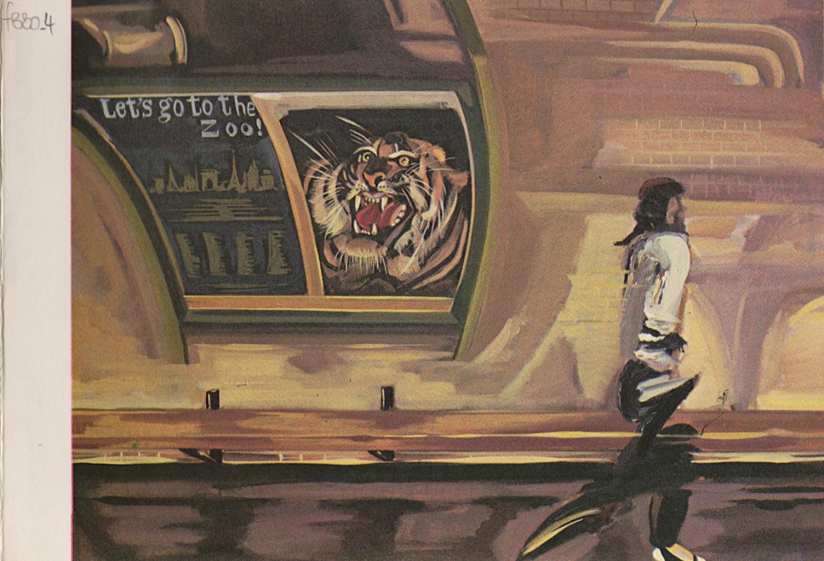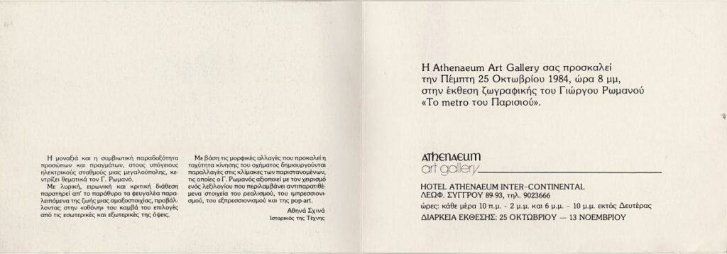 Πρόσκληση εγκαινίων της ατομικής έκθεσης ζωγραφικής του Γιώργου Ρωμανού στην Αθήνα. Περιέχει κριτικό σημείωμα της Αθηνάς Σχινά. Το εξώφυλλο εικονογραφείται με έγχρωμη φωτογραφία του έργου “Let’s go to the Zoo”