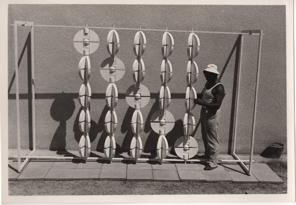 Φωτογραφία του γλύπτη Δημήτρη Κωνσταντίνου μπροστά σε έργο του, α/μ, σε φωτογραφικό χαρτί, 12,3×17,3 εκ.
