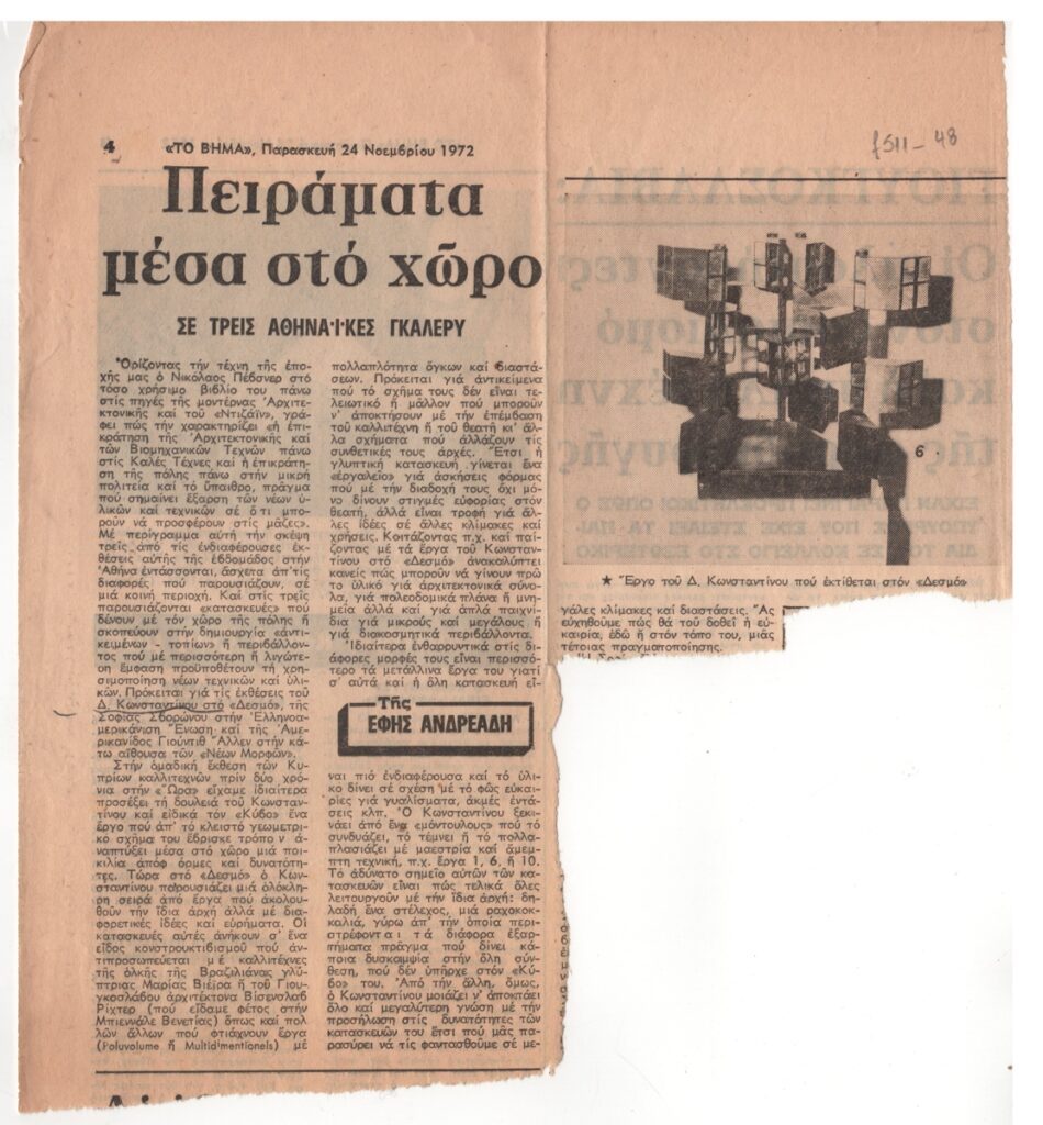Απόκομμα εφημερίδας, στα ελληνικά, χαρτί, 24,5×21,5 εκ. Κριτική της Έφης Ανδρεάδη για την ατομική έκθεση γλυπτικής του Δημήτρη Κωνσταντίνου στην Αθήνα το 1972. Εικονογραφείται με αναπαραγωγή έργου. Στο άρθρο περιλαμβάνονταν και κριτικές για τις ατομικές εκθέσεις γλυπτικής της Σοφίας Σβορώνου και της Γιούντιθ Άλλεν, που έχουν αφαιρεθεί κατά την αποδελτίωση.