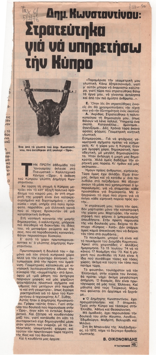 Απόκομμα περιοδικού, στα ελληνικά, χαρτί, 32,0×13,4 εκ. Κριτική του Β. Οικονομίδη για την ατομική έκθεση γλυπτικής του Δημήτρη Κωνσταντίνου στην Αθήνα το 1976. Περιέχει αποσπάσματα συνέντευξης του καλλιτέχνη. Εικονογραφείται με αναπαραγωγή έργου. Επάνω, επιγραφή με τα στοιχεία της δημοσίευσης.