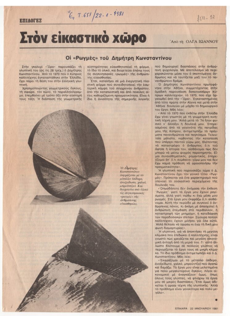 Απόκομμα περιοδικού, στα ελληνικά, χαρτί, 29,3×21,0 εκ. Κριτική της Όλγας Ιωάννου για την ατομική έκθεση γλυπτικής του Δημήτρη Κωνσταντίνου στην Αθήνα το 1981. Εικονογραφείται με αναπαραγωγή δύο έργων. Επάνω, επιγραφή με τα στοιχεία της δημοσίευσης.