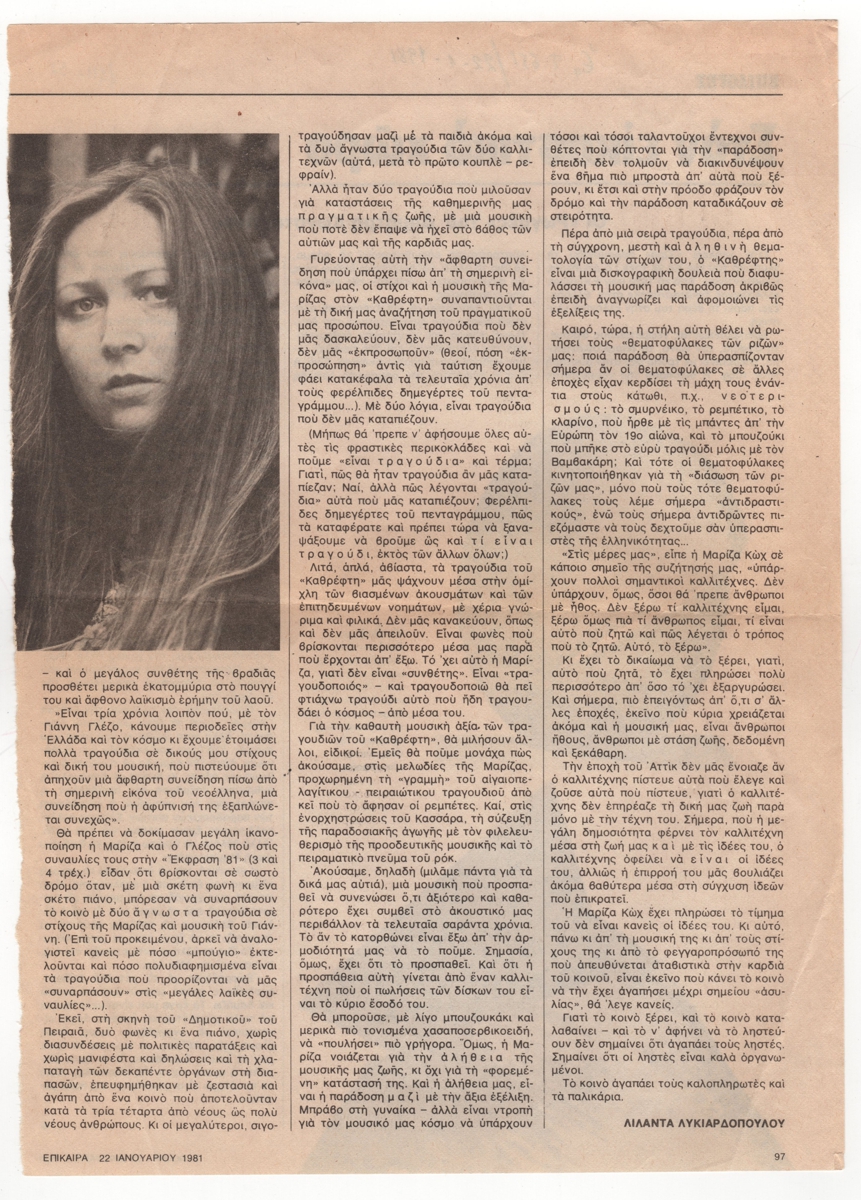 Απόκομμα περιοδικού, στα ελληνικά, χαρτί, 29,2×20,7 εκ. Απόσπασμα συνέντευξης της Μαρίζας Κωχ στη Λιλάντα Λυκιαρδοπούλου. Γίνεται αναφορά στις περιοδείες της με τον Γιάννη Γλέζο και την κυκλοφορία του δίσκου με δικά της τραγούδια με τον τίτλο “Καθρέφτης”. Εικονογραφείται με φωτογραφία της.