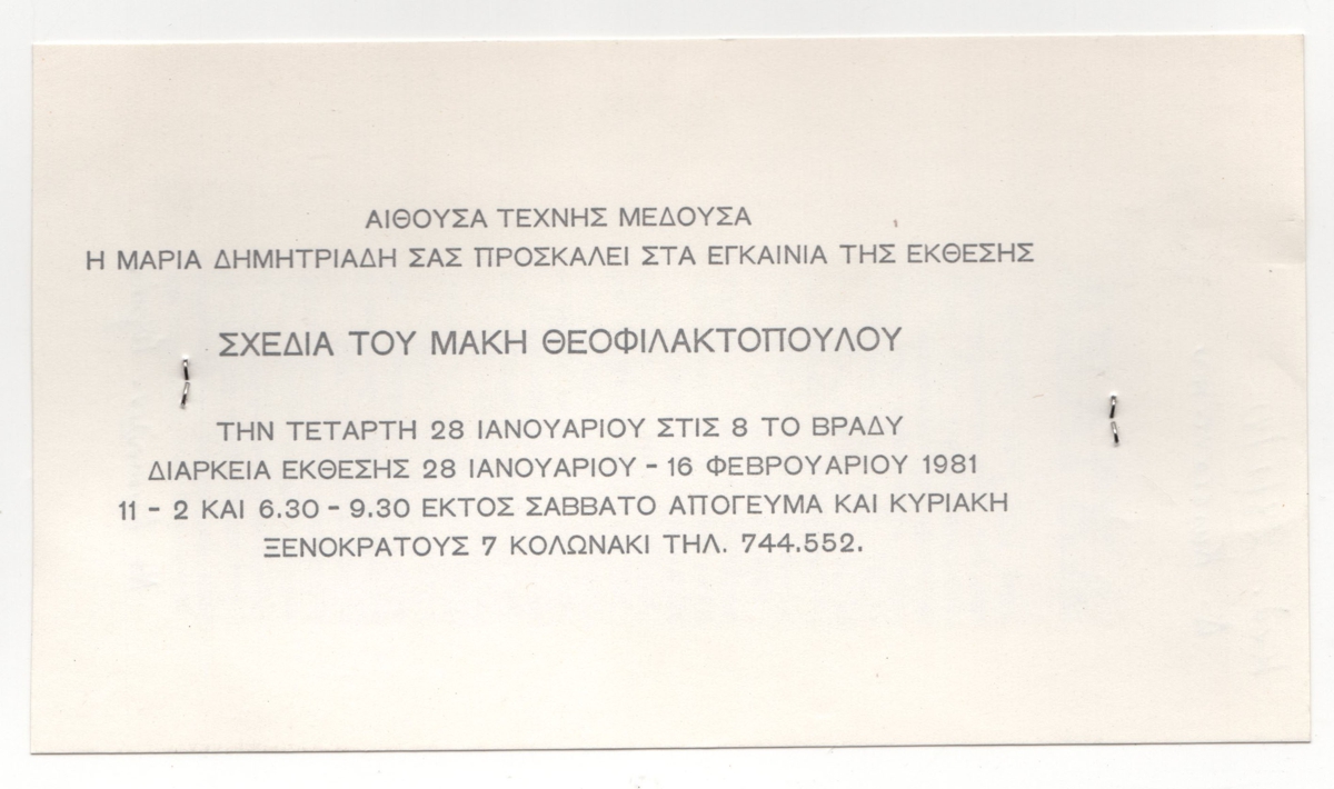 Έντυπο έκθεσης, στα ελληνικά, μονόφυλλο, χαρτόνι, 9,5×17,2 εκ. Πρόσκληση εγκαινίων της ατομικής έκθεσης σχεδίων του Μάκη Θεοφυλακτόπουλου στην Αθήνα το 1981. Το τεκμήριο είχε χρησιμοποιηθεί ως στήριγμα για απόκομμα εφημερίδας με κριτικής της Ντ. Ηλιοπούλου-Ρογκάν για την έκθεση του Δημήτρη Κωνσταντίνου στην Αθήνα την ίδια περίοδο.