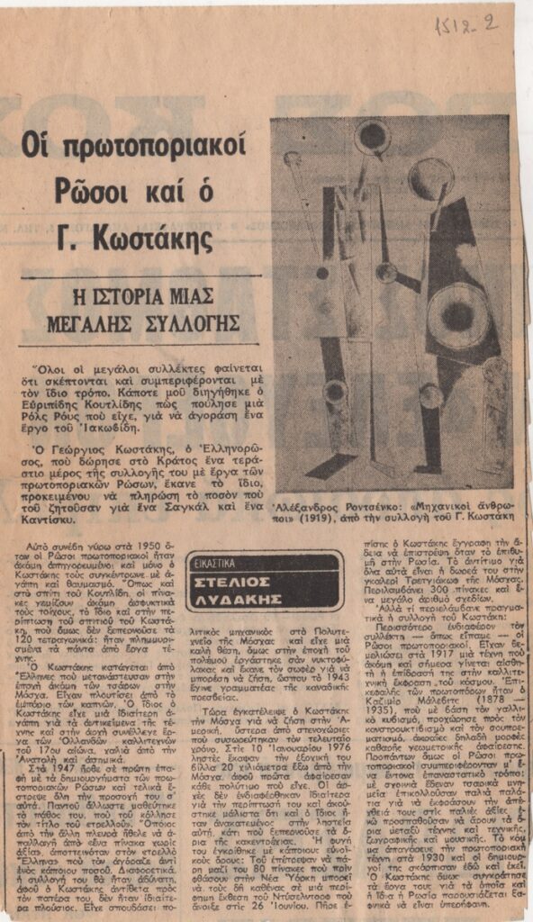 Απόκομμα, χαρτί, 26,5×16 εκ., στα ελληνικά, δημοσίευσης άρθρου για τον Γιώργο Κωστάκη και τη συλλογή έργων Ρωσικής Πρωτοπορίας, μέρος της οποίας δώρησε στο Ελληνικό κράτος.