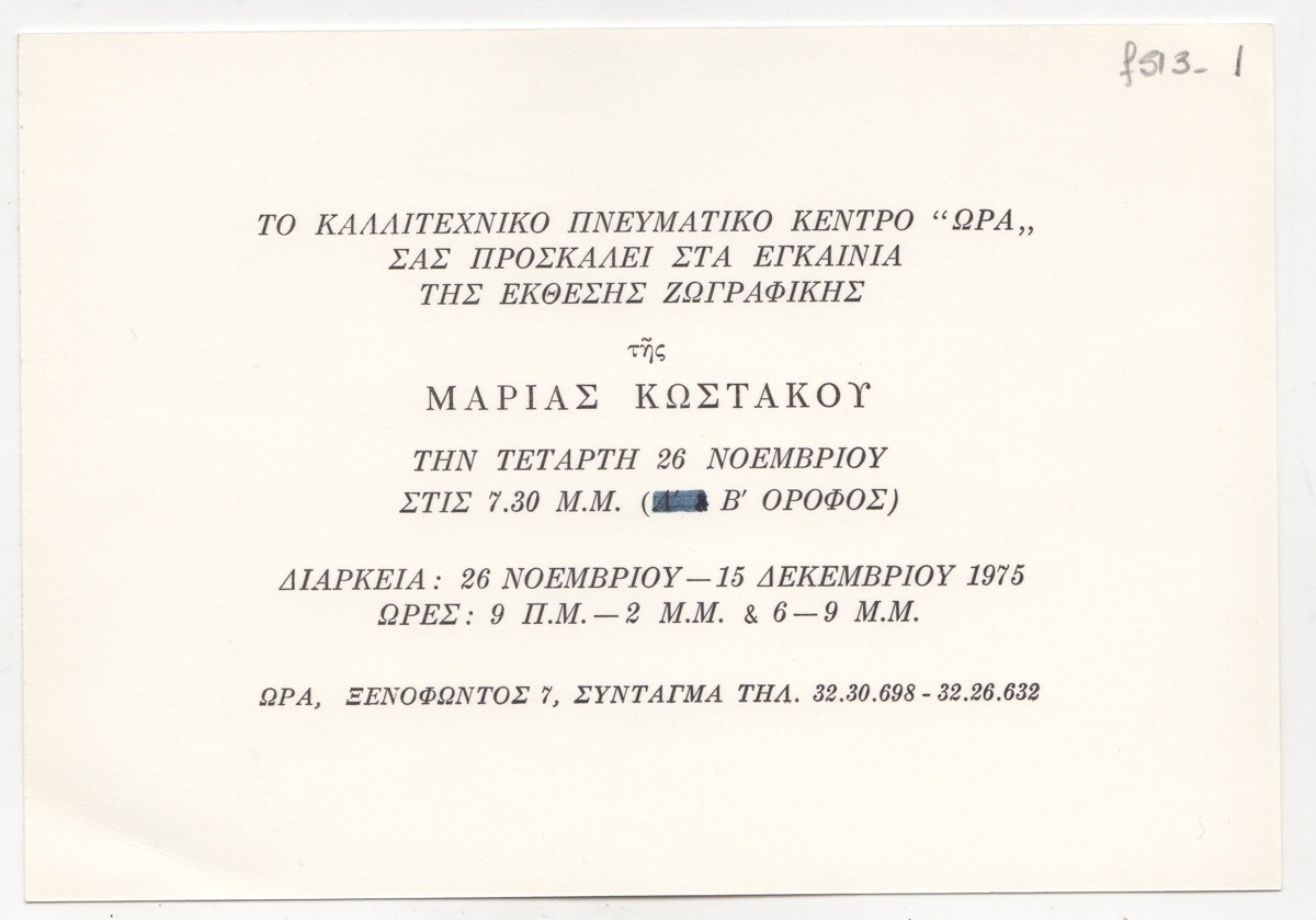 Πρόσκληση, χαρτόνι, 11×16 εκ., στα ελληνικά, εγκαινίων έκθεσης της Μαρίας Κωστάκου.