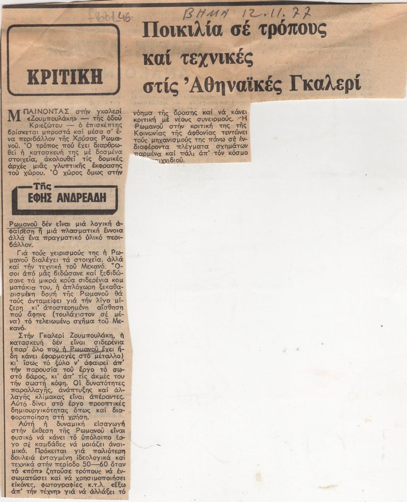 Απόκομμα, χαρτί, στα ελληνικά, δημοσίευσης κριτικής έκθεσης της Χρύσας Ρωμανού, η οποία διεξάγεται στην Γκαλερί Ζουμπουλάκη στην Αθήνα.