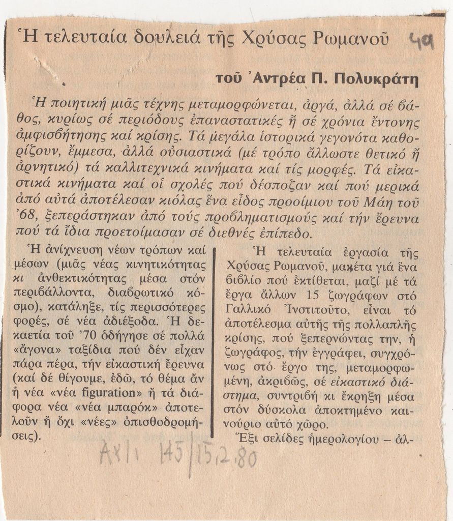 Απόκομμα, χαρτί, 2 φφ, 11,5×10 και 11,5×14,5 εκ., στα ελληνικά, δημοσίευσης κριτικής έκθεσης της Χρύσας Ρωμανού, η οποία διεξάγεται στο Γαλλικό Ινστιτούτο Αθηνών.