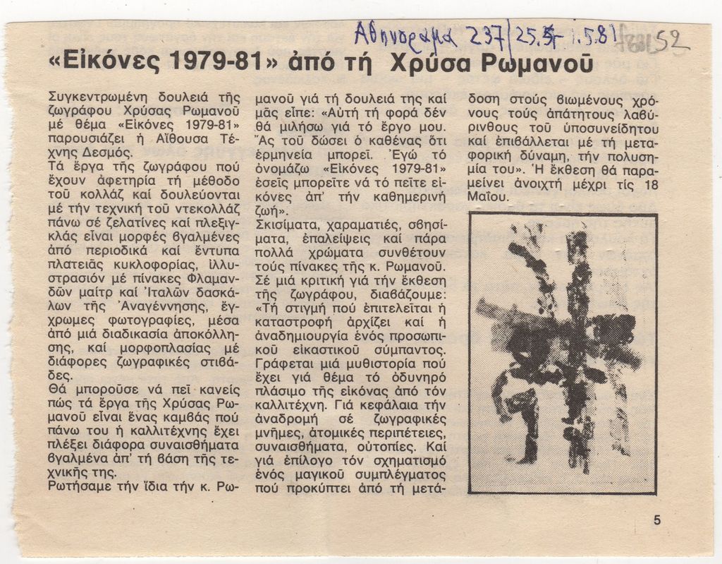 Απόκομμα, χαρτί, 10.5×13.5 εκ., στα ελληνικά, δημοσίευσης κριτικής έκθεσης της Χρύσας Ρωμανού με τίτλο “Εικόνες 1979-81”, στην Αθήνα.