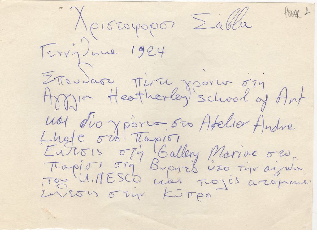Βιογραφικό, ιδιόγραφο του καλλιτέχνη, χαρτί, 15×20 εκ., στα ελληνικά. Αναφέρεται σε σπουδές και σε εκθέσεις του.