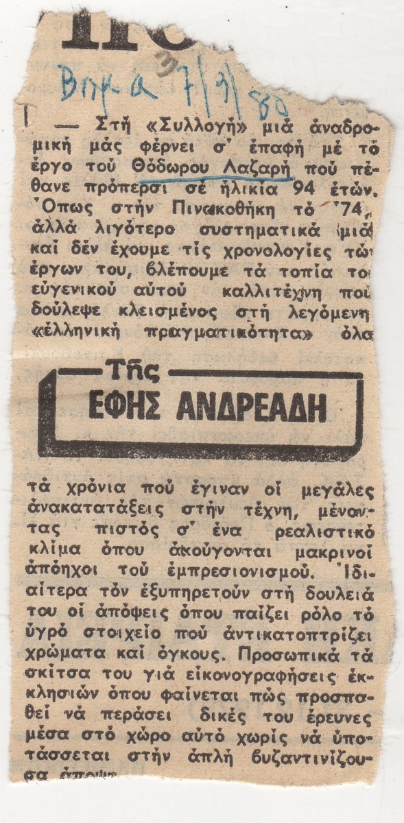 Απόκομμα, χαρτί, 10×5 εκ., στα ελληνικά, δημοσίευσης κριτικής έκθεσης του Θεόδωρου Λαζαρή, η οποία διεξάγεται στην Αίθουσα Τέχνης Συλλογή, στην Αθήνα.