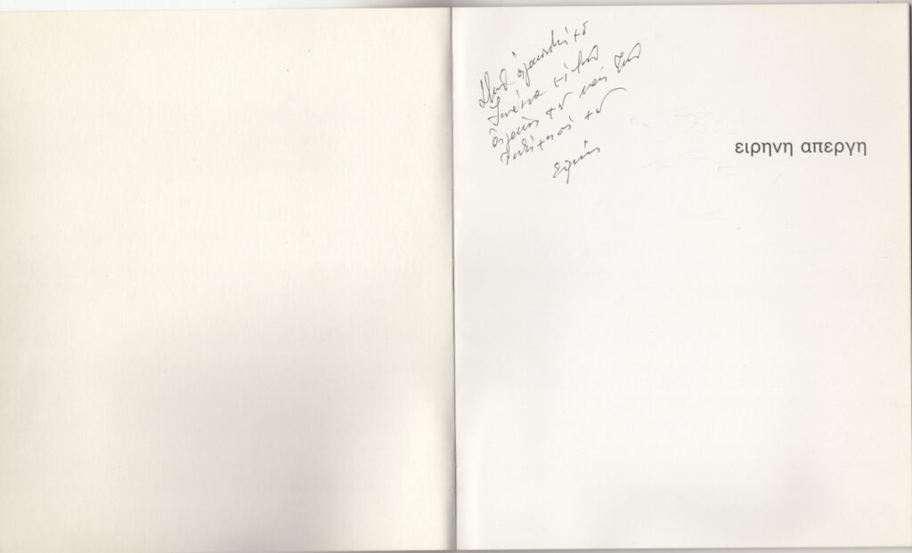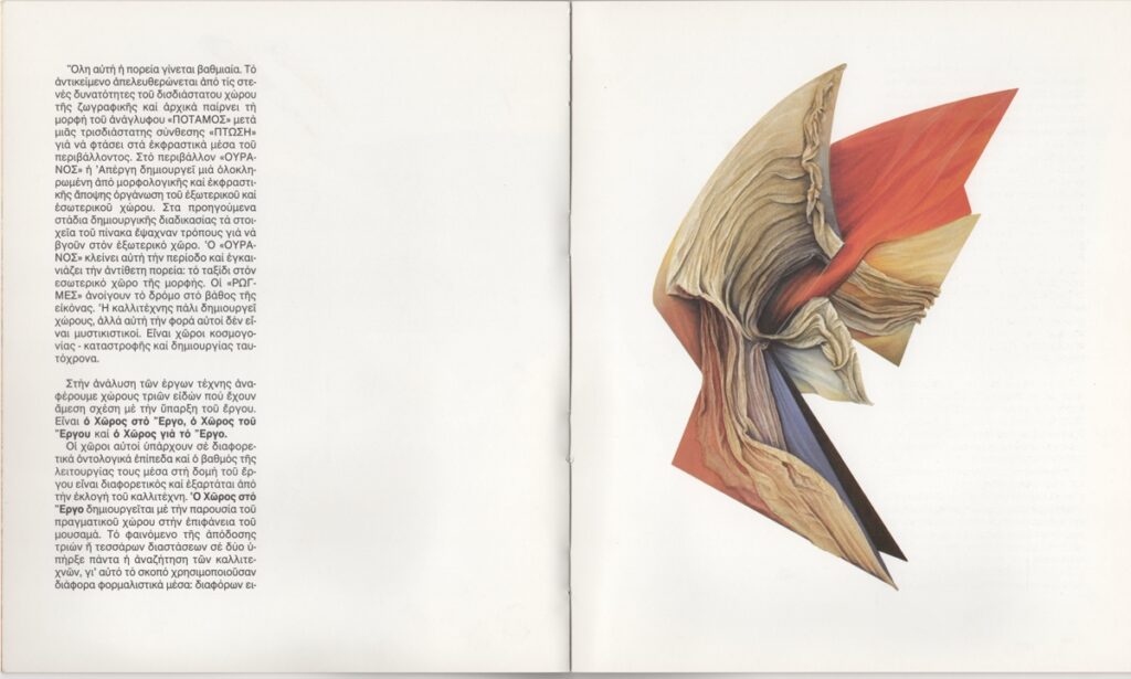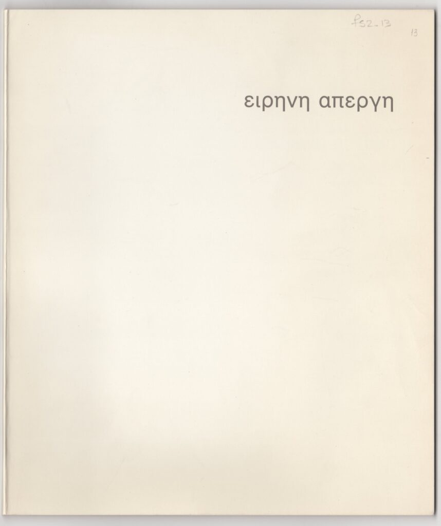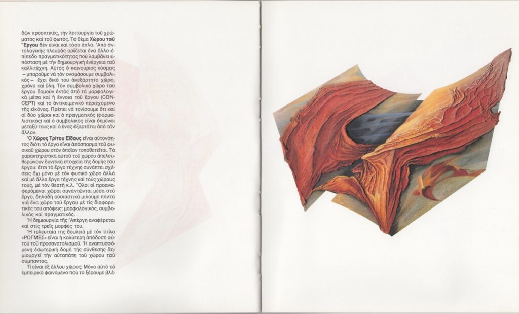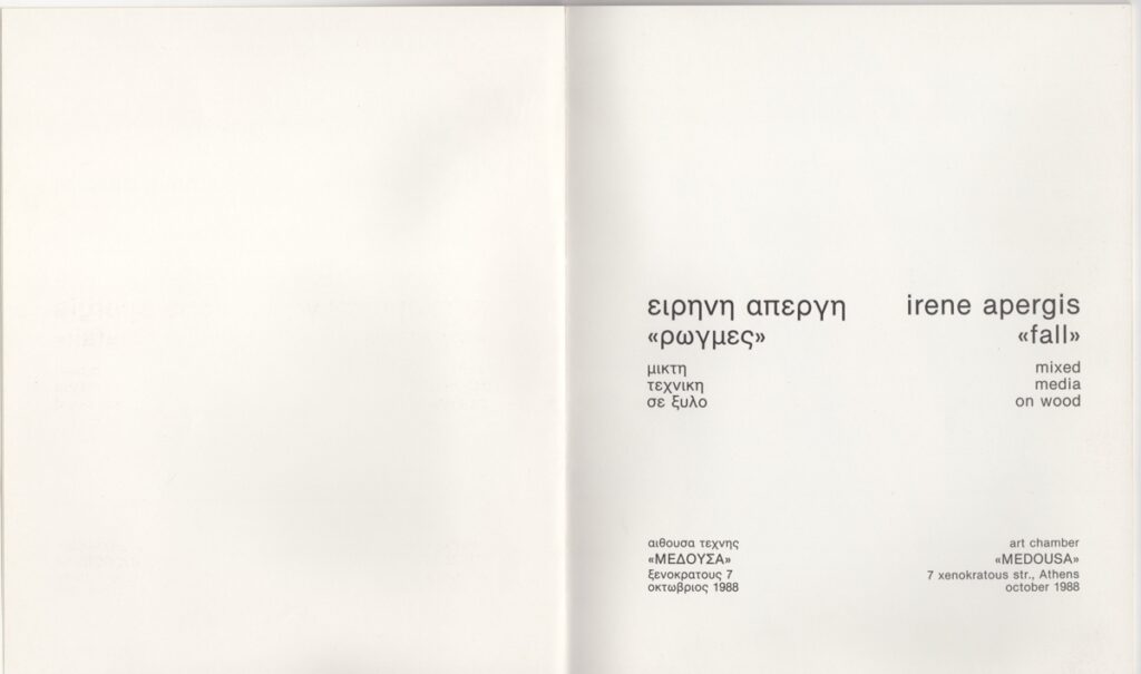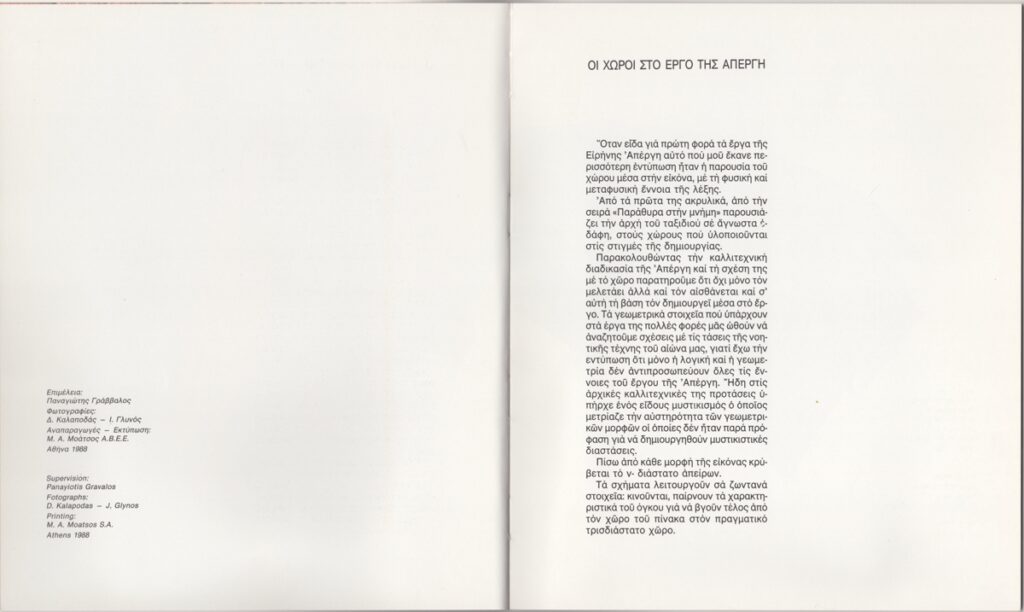 Έντυπο, ιλουστρασιόν χαρτί, 18 φφ, 24,0×20,5 εκ., στα ελληνικά και αγγλικά. Περιέχει κείμενο της Elzbieta Koscielak με τίτλο “Οι χώροι στο έργο της Απέργη” / “The spaces in the work of Apergi” (23/01/1988) και κατάλογο εκθέσεων της καλλιτέχνιδος. Στην πρώτη σελίδα χειρόγραφη αφιέρωση.