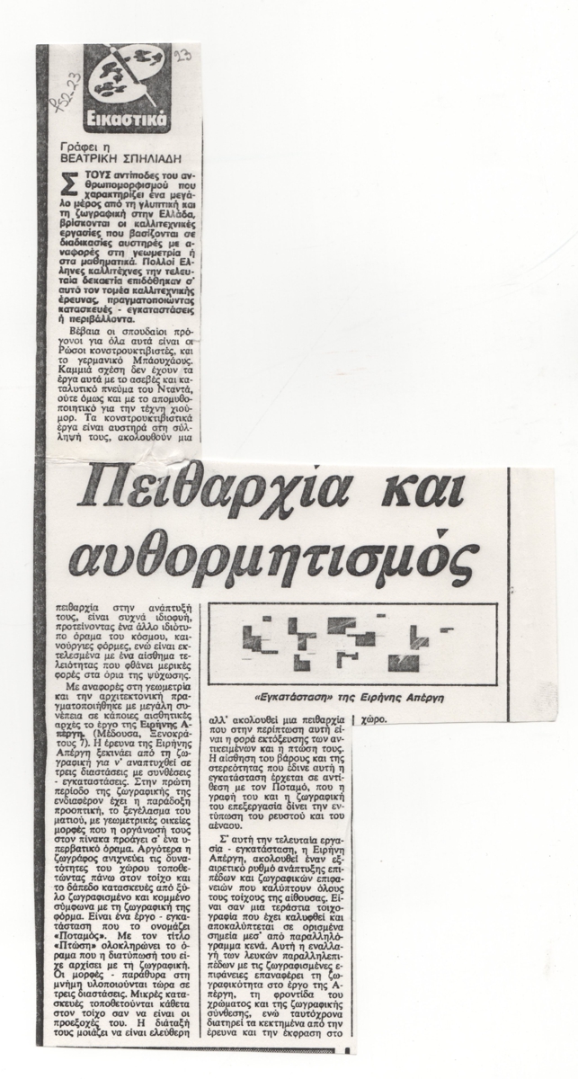 Φωτοαντίγραφο αποκόμματος, έντυπο, χαρτί, 27,5×14,2 εκ. (ακανόνιστο σχήμα), όπου δημοσιεύεται, στα ελληνικά, κριτική της Βεατρίκης Σπηλιάδη για την ατομική έκθεση έργων της Ειρήνης Απέργη στην Αθήνα το 1985.