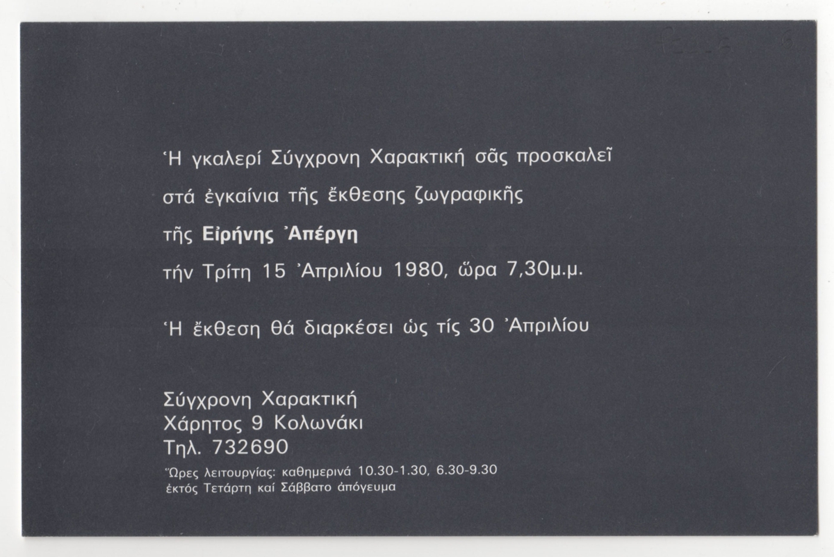 Έντυπο, μονόφυλλο, ιλουστρασιόν χαρτόνι, 11,0×17,0 εκ., στα ελληνικά. Πρόσκληση της ατομικής έκθεσης ζωγραφικής της Ειρήνης Απέργη στην Αθήνα το 1980.