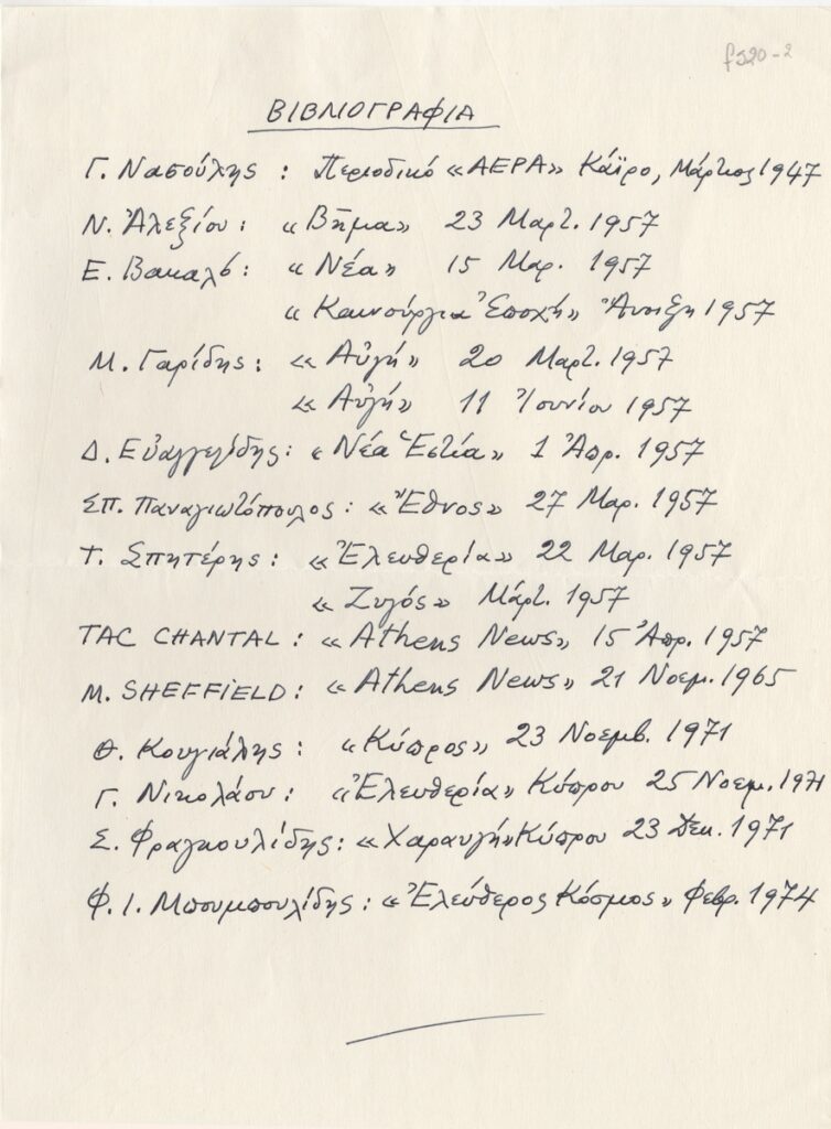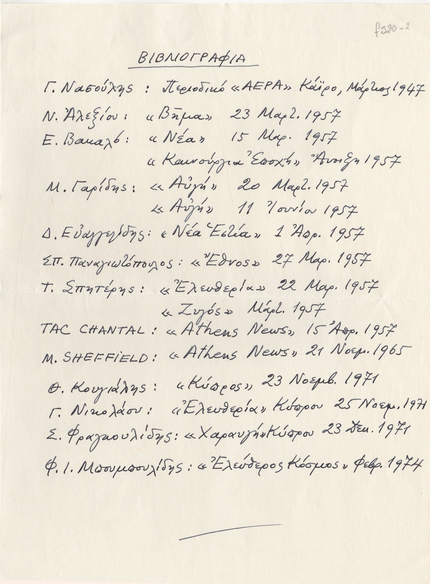 Βιβλιογραφία, χειρόγραφη, χαρτί, 29×21 εκ., στα ελληνικά, για τον Ανατολή Λαζαρίδη. Αναφέρονται κριτικές δημοσιευμένες στον Τύπο της περιόδου 1947-1974.