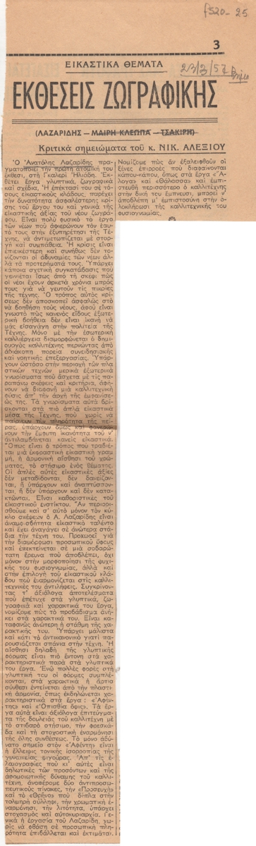 Απόκομμα, χαρτί ακανόνιστου μεγέθους, στα ελληνικά, δημοσίευσης κριτκής έκθεσης του Ανατολή Λαζαρίδη, η οποία διεξάγεται στην Γκαλερί Ηλιάδη στην Αθήνα.