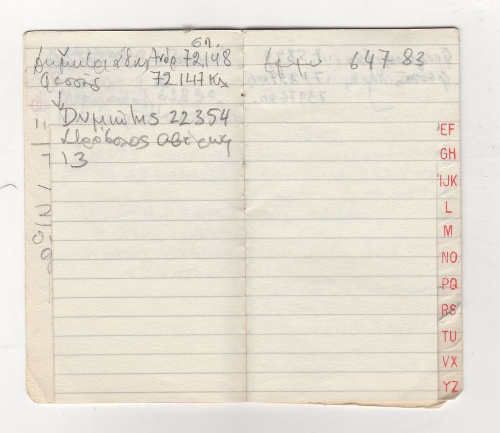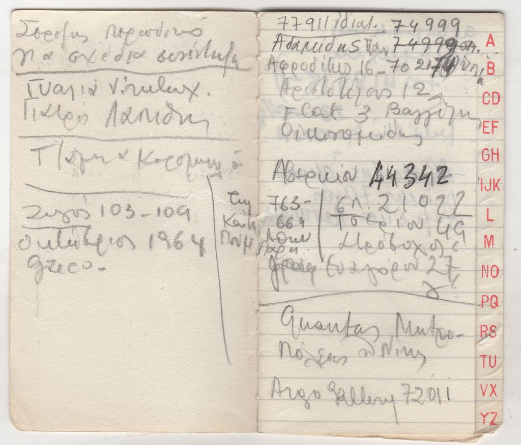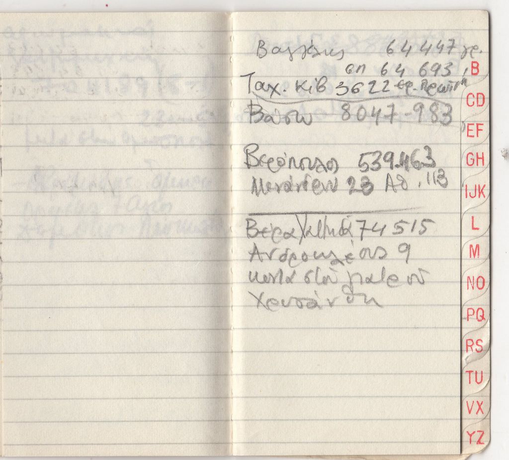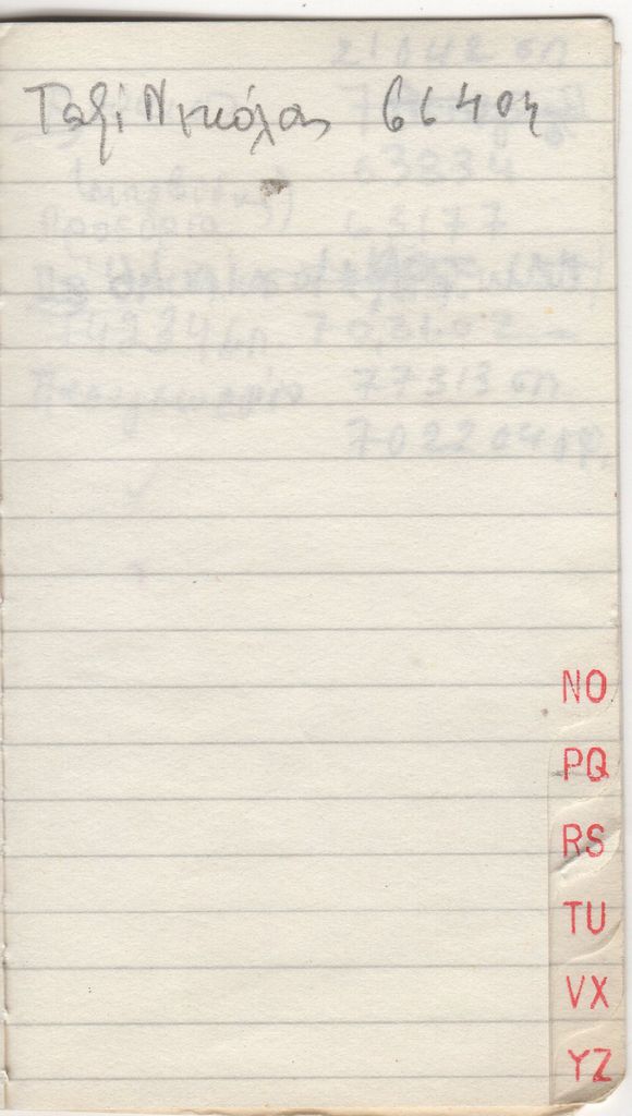 Τηλεφωνική ατζέντα, χαρτί, 10×6 εκ., με χειρόγραφες σημειώσεις, στα ελληνικά.