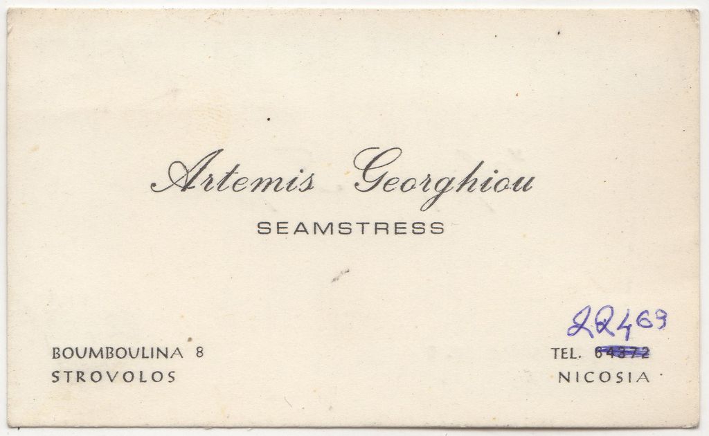 Επαγγελματική κάρτα της Άρτεμις Γεωργίου, 5×9 εκ., στα ελληνικά και αγγλικά.