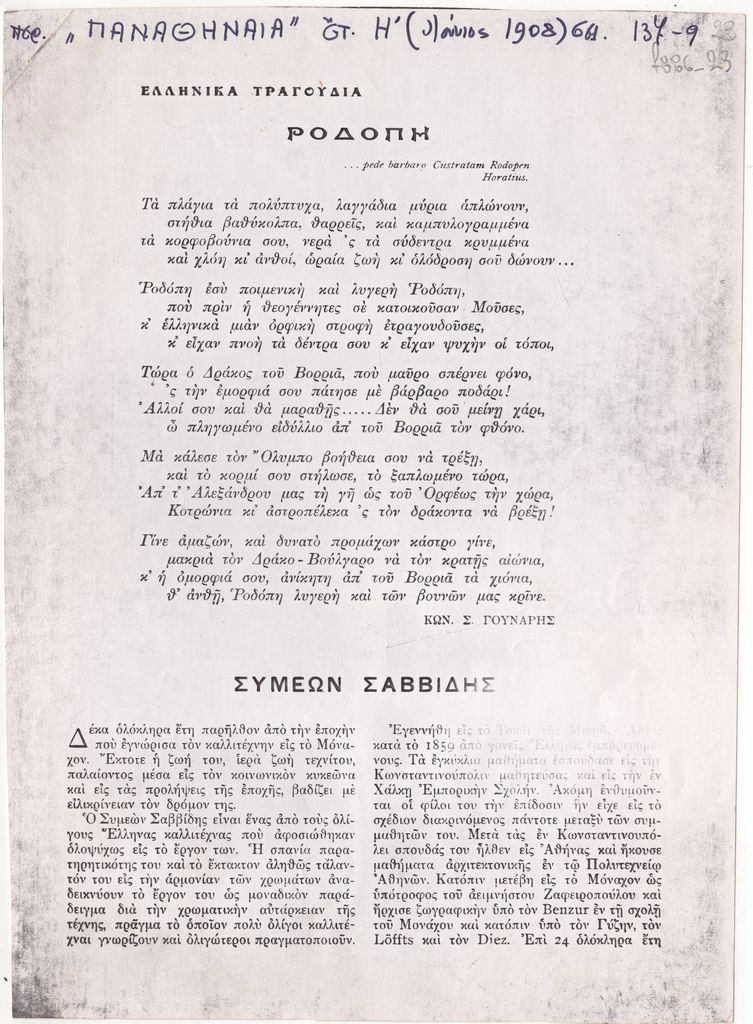 Στο πρώτο φύλλο δημοσιεύεται επίσης, στα ελληνικά, το τραγούδι του Κων. Σ. Γούναρη με τίτλο “Ροδόπη”. Επιγραφή, με τα στοιχεία της δημοσίευσης.
