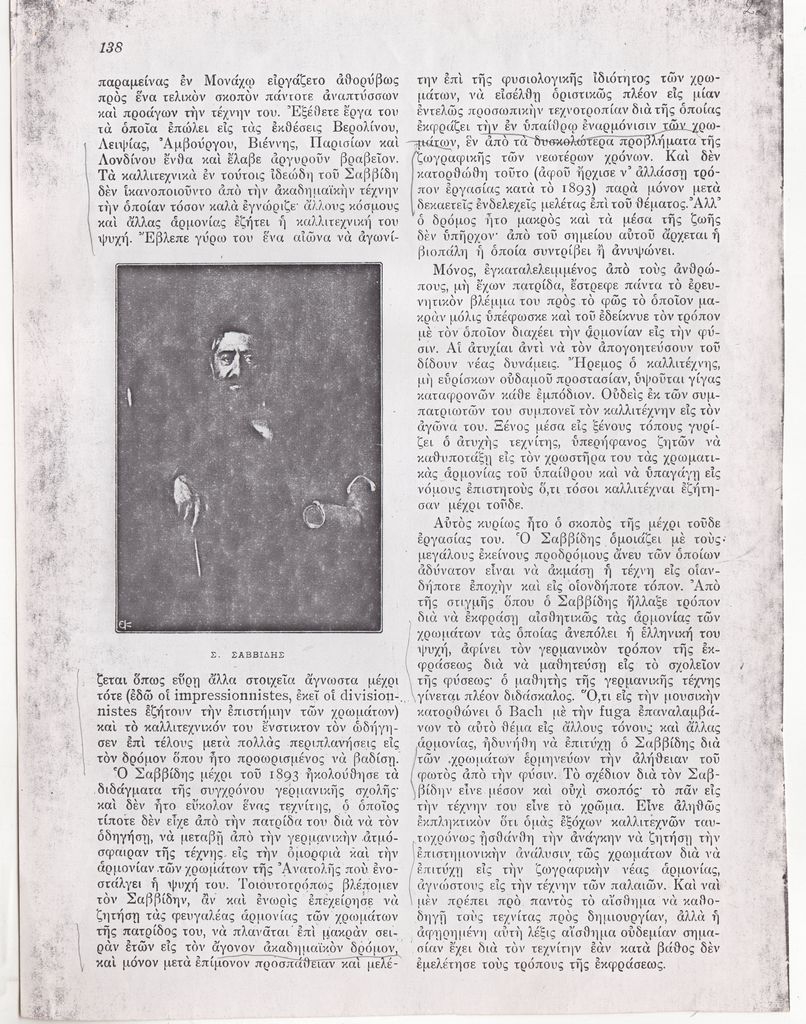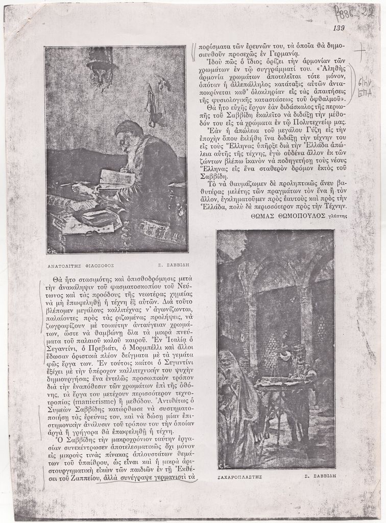 Φωτοαντίγραφο αποκόμματος, έντυπο, χαρτί, 3 φφ, μίας όψης, 25,5×18,5 εκ., όπου δημοσιεύεται, στα ελληνικά, άρθρο του Θωμά Θωμόπουλου για τον ζωγράφο Συμεών Σαββίδη. Στην πρώτη σελίδα, χειρόγραφη επιγραφή με τα στοιχεία της δημοσίευσης.
