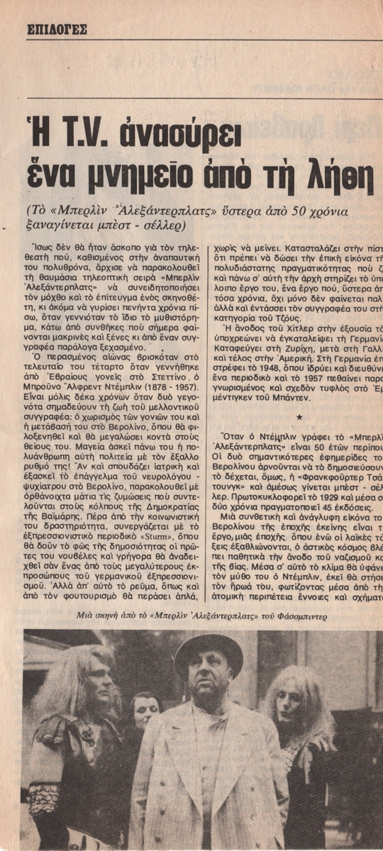 Απόκομμα περιοδικού, στα ελληνικά, χαρτί, 29,0×13,3 εκ. Άρθρο για την προβολή από την ελληνική τηλεόραση της τηλεοπτικής μεταφοράς του μυθιστορήματος του Bruno Alfred Döblin με τίτλο “Berlin Alexanderplatz” σε σκηνοθεσία R. W. Fassbinder. Εικονογραφείται με αναπαραγωγή φωτογραφίας από τη σειρά.
