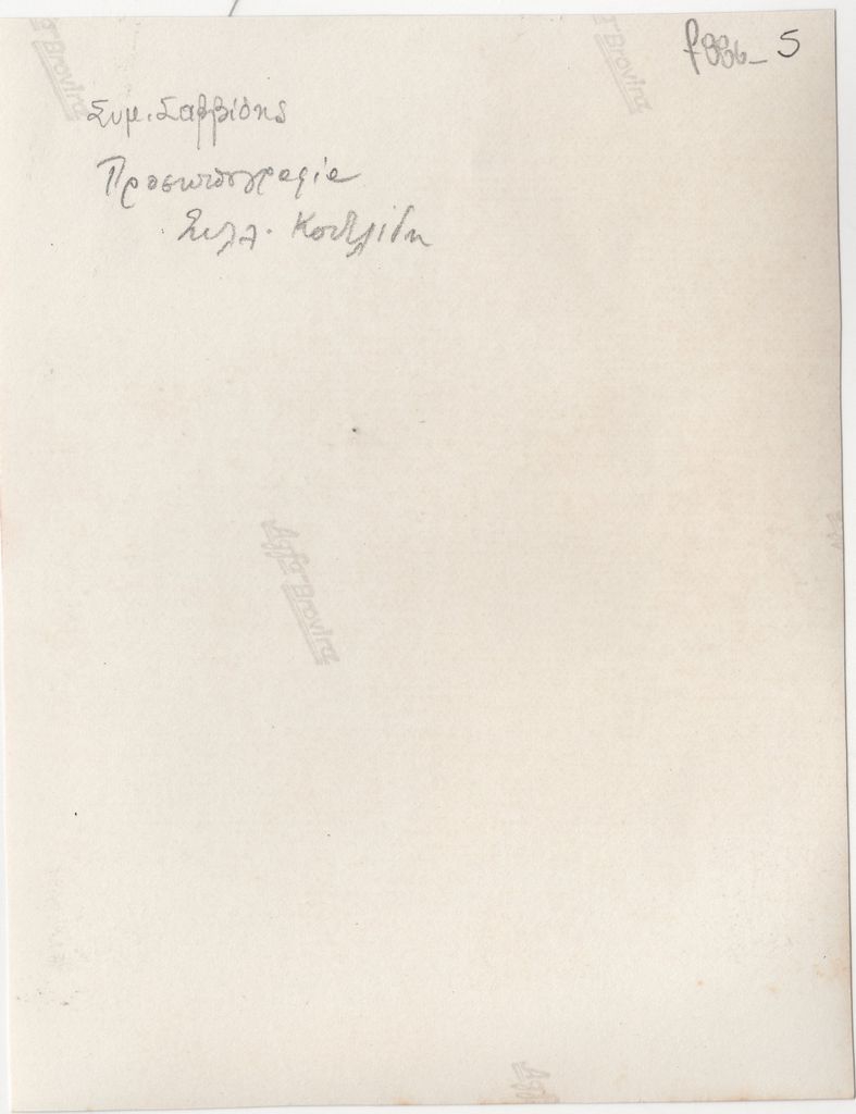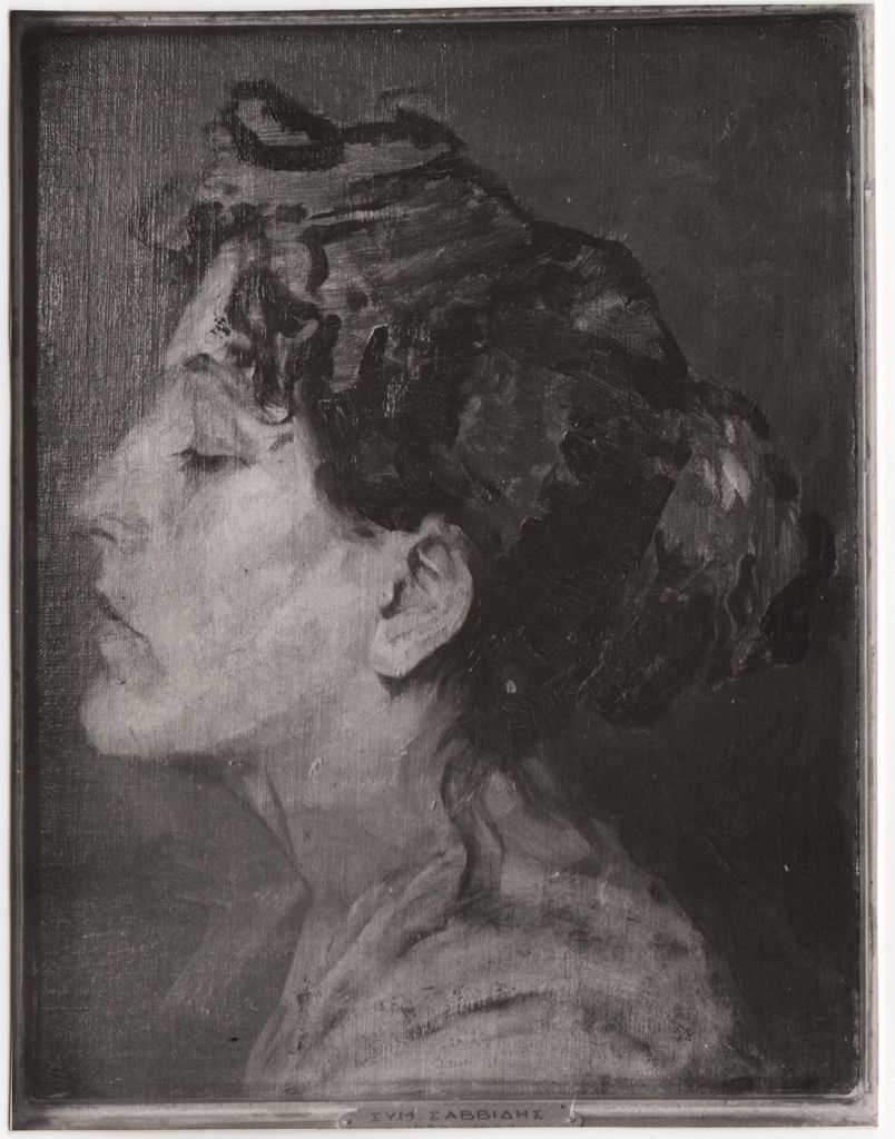 Φωτoγραφία, α/μ, φωτογραφικό χαρτί, 15,3×12,0 εκ. Αναπαραγωγή του έργου του Συμεών Σαββίδη «Προσωπογραφία». Στην πίσω όψη, επιγραφή με τα στοιχεία του έργου.