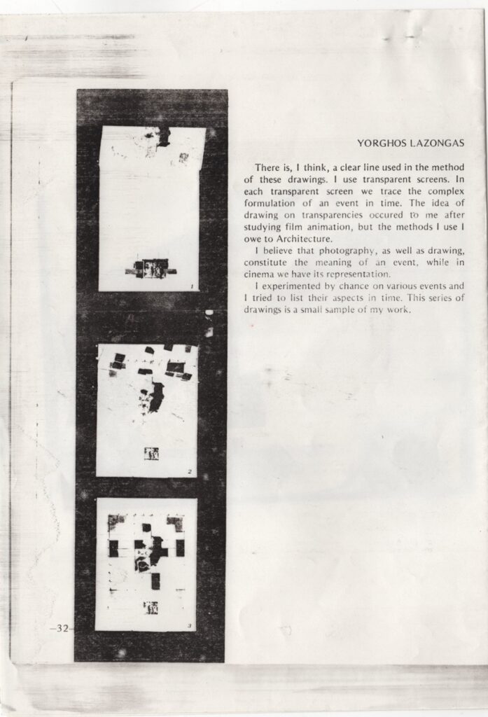 Φωτοαντίγραφο αποκόμματος περιοδικού, στα ελληνικά και αγγλικά, χαρτί, 2 φφ., 25,7×36,2 και 29,8×21,0 εκ. Κείμενο του Γιώργου Λαζόγκα με τα οποίο σχολιάζει δύο έργα του που αναπαράγονται ως εικονογράφηση. Η δεύτερη σελίδα του τεκμηρίου αποτελεί φωτοαντίγραφο της σελίδα του εξωφύλλου του περιοδικού, το οποίο εικονογραφείται με ανπαραγωγή έργου.