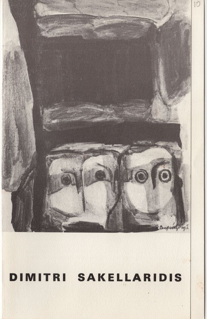Έντυπο, στα γαλλικά, δίπτυχο, χαρτόνι, 20,8×13,2 εκ., της ατομικής έκθεσης ζωγραφικής του Δημήτρη Σακελλαρίδη. Περιέχει σύντομο βιογραφικό καλλιτέχνη και κριτική κείμενο του Jacques Lacarrière. Στο εξώφυλλο, εικονογράφηση. Χειρόγραφες συμπληρώσεις στο βιογραφικό (εκθέσεις περιόδου 1969-1971).