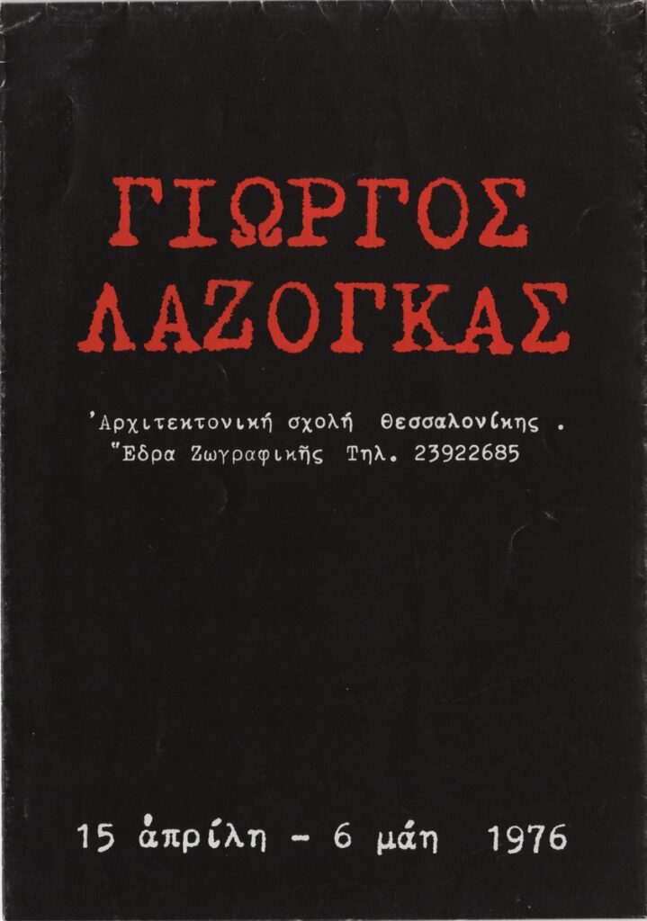 Έντυπο έκθεσης, πολύπτυχο, σε ιλουστρασιόν χαρτί, στα ελληνικά, 24,0×17,0 εκ. Το έντυπο αφορά την ατομική έκθεση ζωγραφικής του Γιώργου Λαζόγκα στην Αθήνα το 1976. Περιέχει κείμενα του Γιάννη Κοντού, του Χρύσανθου Χρήστου με τίτλο “Η ζωγραφική του Γιώργου Λαζόγκα. Μεταφορά της οπτικής πραγματικότητας σε νέες εκφραστικές αξίες” και του Δ. Α. Φατούρου. Εικονογραφείται με αναπαραγωγή έργου και φωτογραφιών του καλλιτέχνη στο ατελιέ του.