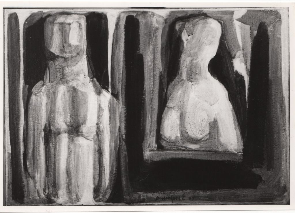 Φωτογραφία, α/μ, φωτογραφικό χαρτί, 12,3×17,8 εκ. Αναπαραγωγή του έργου του Δημήτρη Σακελλαρίδη «Οι Αδιάφοροι» (ακρυλικό, 1967). Στην πίσω όψη, επιγραφή με τα στοιχεία του έργου και σφραγίδα αρίθμησης.