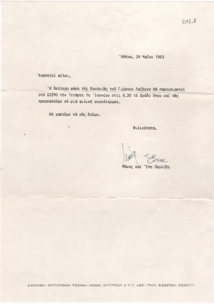 Έντυπο έκθεσης, δακτυλόγραφο, στα ελληνικά, χαρτί, 29,8×21,2 εκ. Πρόσκληση στην παρουσίαση της δεύτερης φάσης της δουλειάς του Γιώργου Λαζόγκα στην Αθήνα τον Ιούνιο του 1983.