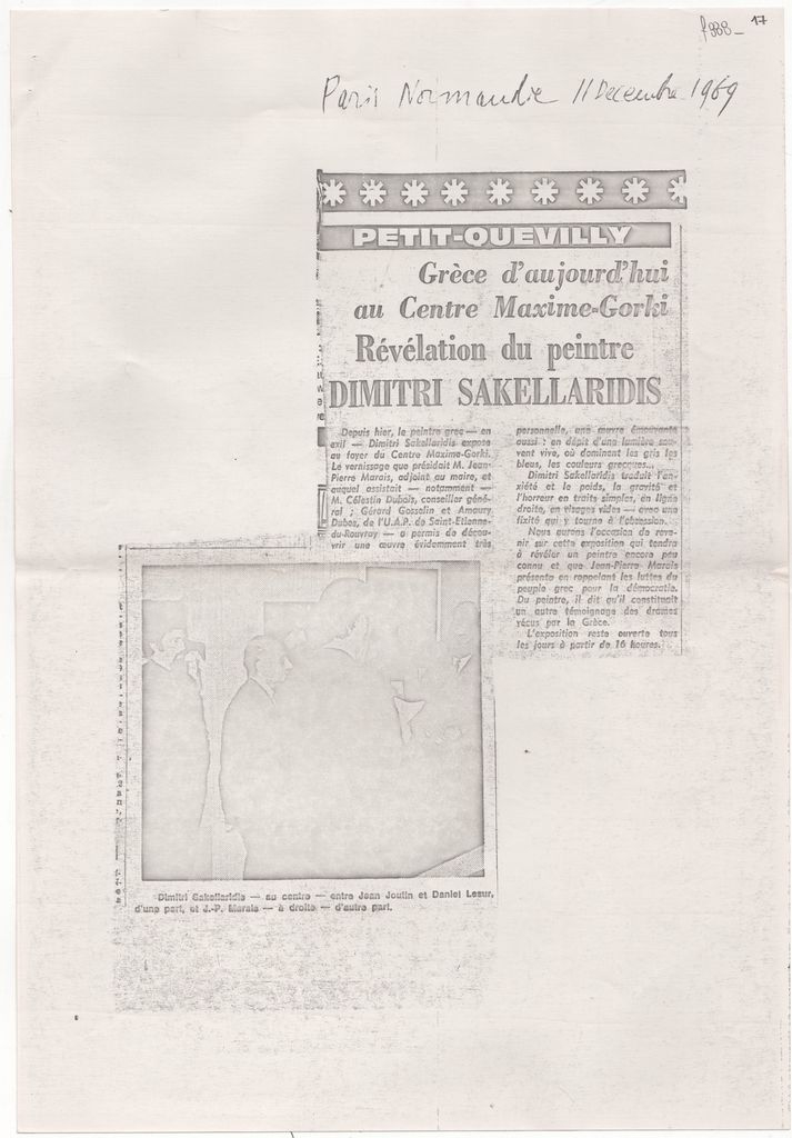 Φωτοαντίγραφο αποκόμματος, έντυπο, χαρτί, 29,8×21,0 εκ., όπου δημοσιεύεται, στα γαλλικά, κριτική της ατομικής έκθεσης ζωγραφικής του Δημήτρη Σακελλαρίδη στη Rouen το 1969 στο πλαίσιο της διοργάνωσης “Grèce d’aujourd’hui. Επάνω, χειρόγραφη επιγραφή με τα στοιχεία της δημοσίευσης.