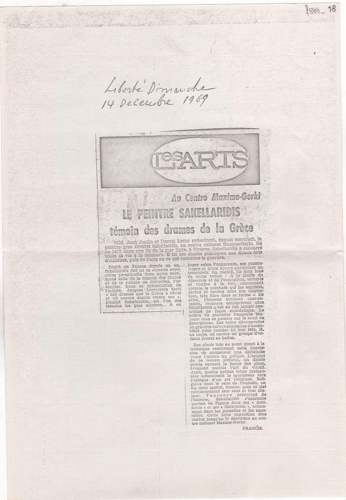 Φωτοαντίγραφο αποκόμματος, έντυπο, χαρτί, 29,8×21,0 εκ., όπου δημοσιεύεται, στα γαλλικά, κριτική του Francis της ατομικής έκθεσης ζωγραφικής του Δημήτρη Σακελλαρίδη στη Ρουέν το 1969. Επάνω, επιγραφή με τα στοιχεία της δημοσιεύσης.