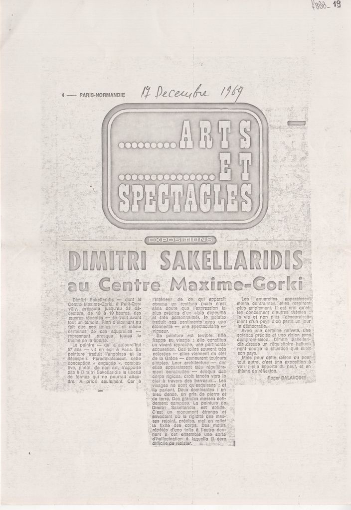 Φωτοαντίγραφο αποκόμματος, έντυπο, χαρτί, 29,8×21,0 εκ., όπου δημοσιεύεται, στα γαλλικά, κριτική της έκθεσης του Δημήτρη Σακελλαρίδη στη Ρουέν το 1969. Επάνω, επιγραφή με τα στοιχεία της δημοσίευσης.
