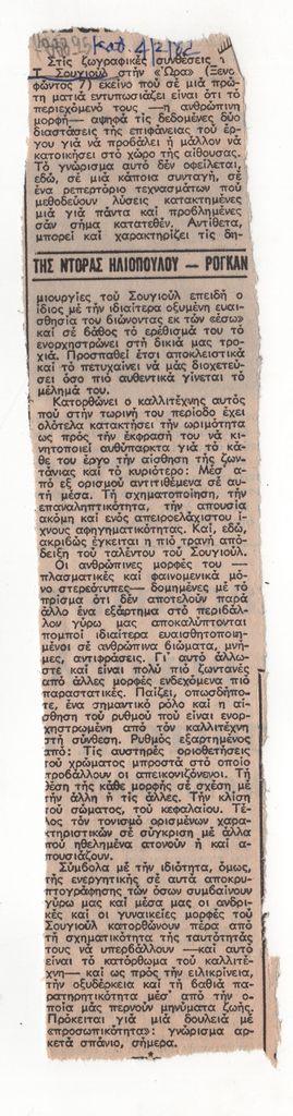 Απόκομμα, έντυπο, χαρτί, 23,5×5,3 εκ., όπου δημοσιεύεται, στα ελληνικά, κριτική της Ντόρας Ηλιοπούλου-Ρογκάν για την ατομική έκθεση ζωγραφικής του Τάσου Σουγιούλ στην Αθήνα το 1982. Επάνω, επιγραφή με τα στοιχεία της δημοσίευσης.
