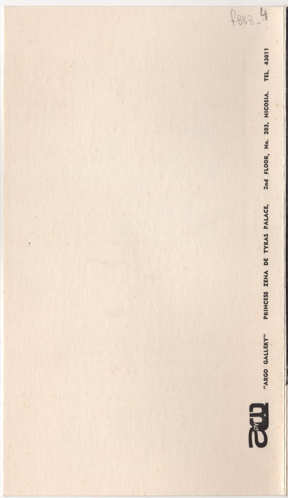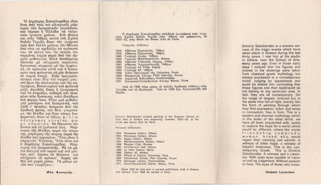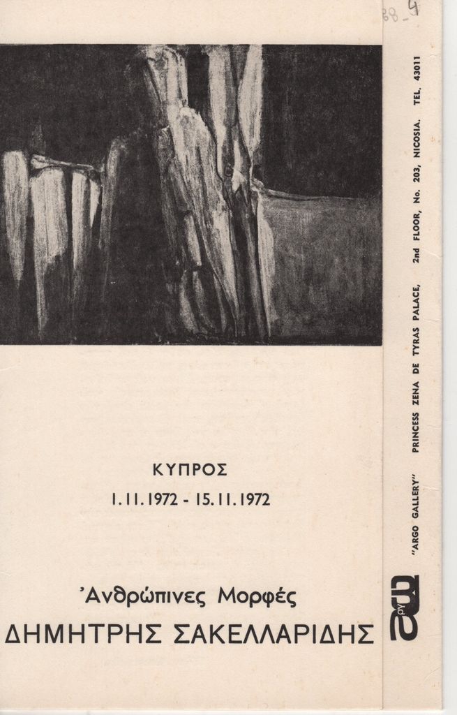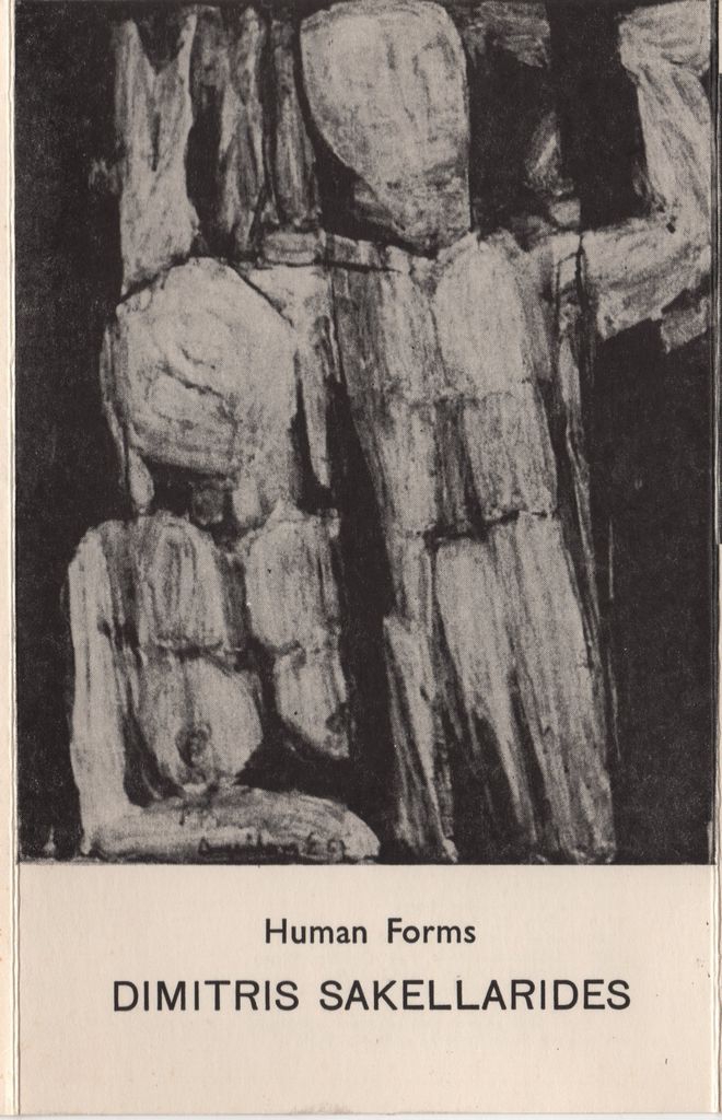 Έντυπο, στα ελληνικά και αγγλικά, τρίπτυχο, χαρτόνι, 20,0×12,5 εκ., της ατομικής έκθεσης ζωγραφικής του Δημήτρη Σακελλαρίδη με τίτλο «Ανθρώπινες Μορφές» στη Λευκωσία το 1972. Περιέχει κριτικό κείμενο του Jacques Lacarière και σύντομο βιογραφικό καλλιτέχνη. Στο εξώφυλλο και το οπισθόφυλλο, εικονογράφηση