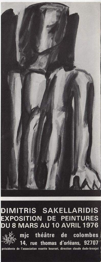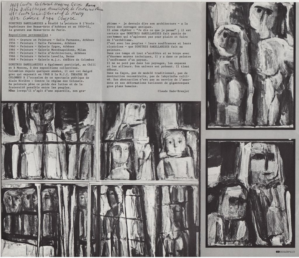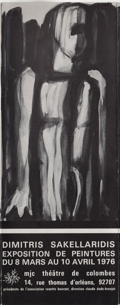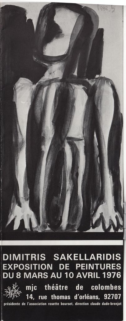 Έντυπο, στα γαλλικά, τρίπτυχο, χαρτί, 27,0×31,0 εκ., της ατομικής έκθεσης ζωγραφικής του Δημήτρη Σακελλαρίδη στο Colombes το 1976. Περιέχει βιογραφικό καλλιτέχνη και κείμενο του Claude Dade-Brenjot.