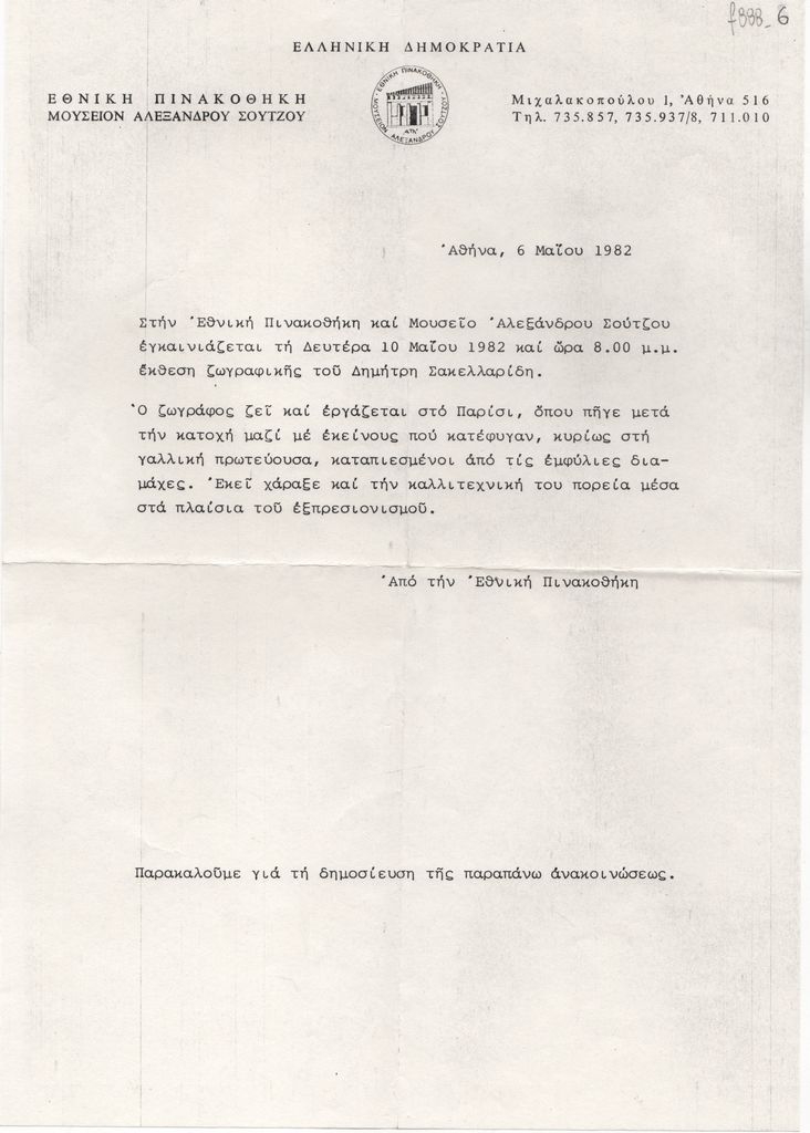 Κείμενο, δακτυλόγραφο, στα ελληνικά, χαρτί, 29,8×21,0 εκ. Δελτίο τύπου της ατομικής έκθεσης ζωγραφικής του Δημήτρη Σακελλαρίδη στην Αθήνα το 1982.
