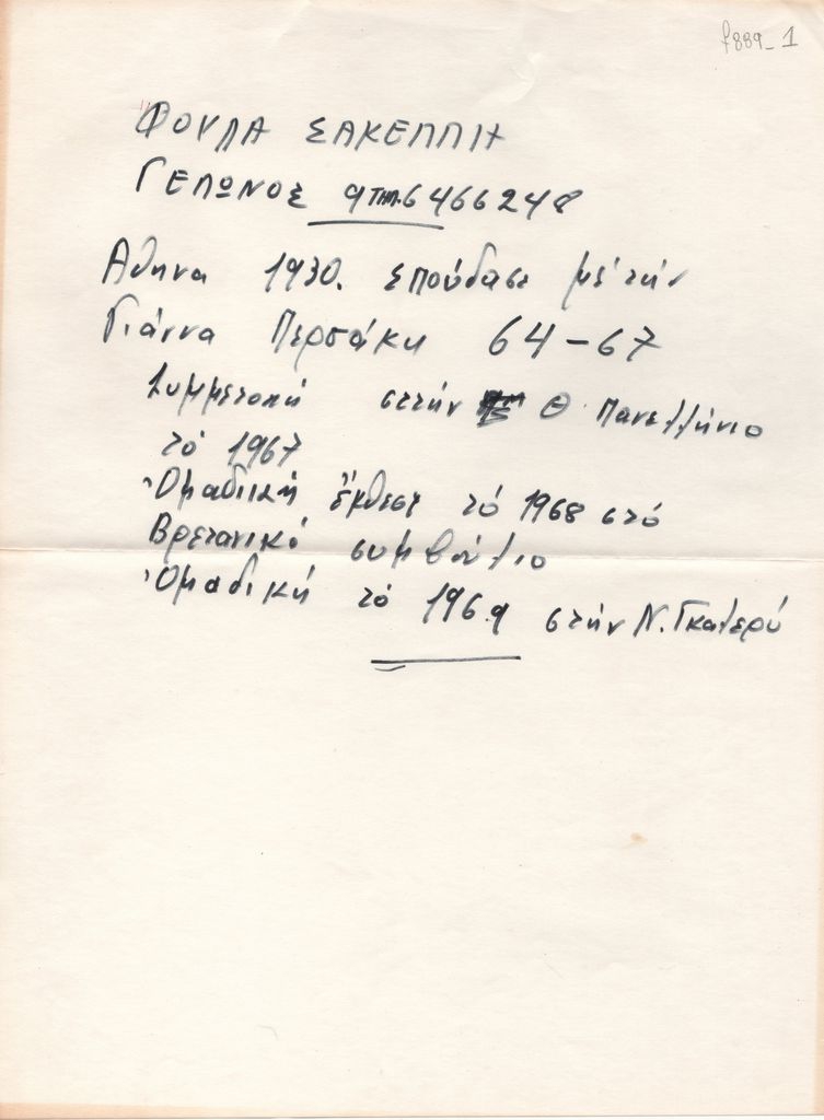 Κείμενο, χειρόγραφο, στα ελληνικά, χαρτί, 28,7×21,5 εκ. Σημειώσεις βιογραφικού σημειώματος της Φούλας Σακέλλη. Αναφέρονται σπουδές και εκθέσεις.
