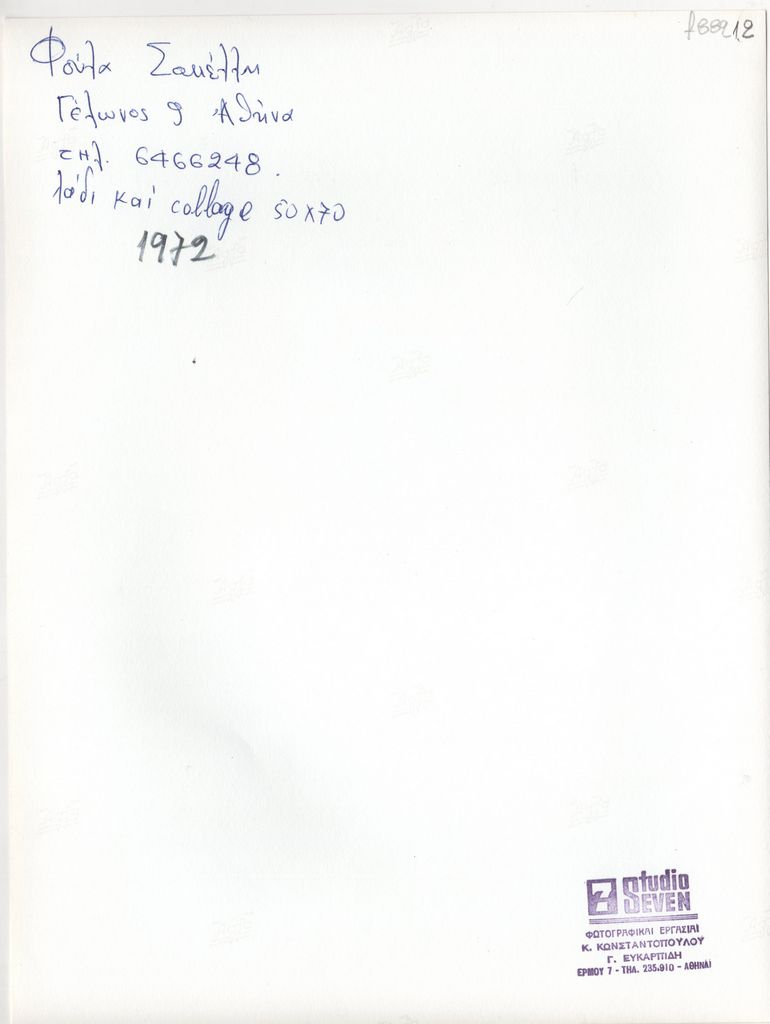 Φωτογραφία, α/μ, φωτογραφικό χαρτί, 24,0×18,0 εκ. Αναπαραγωγή έργου της Φούλας Σακέλλη. Στην πίσω όψη, επιγραφή και σφραγίδα του φωτογράφου Studio 7 Κ. Κωνσταντόπουλου Γ. Ευκαρπίδη.