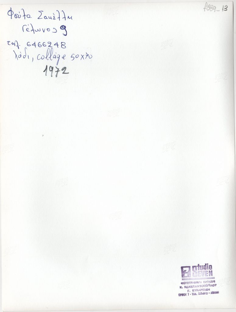 Φωτογραφία, α/μ, φωτογραφικό χαρτί, 24,0×18,0 εκ. Αναπαραγωγή έργου της Φούλας Σακέλλη. Στην πίσω όψη, επιγραφή και σφραγίδα του φωτογράφου Studio 7 Κ. Κωνσταντόπουλου Γ. Ευκαρπίδη.