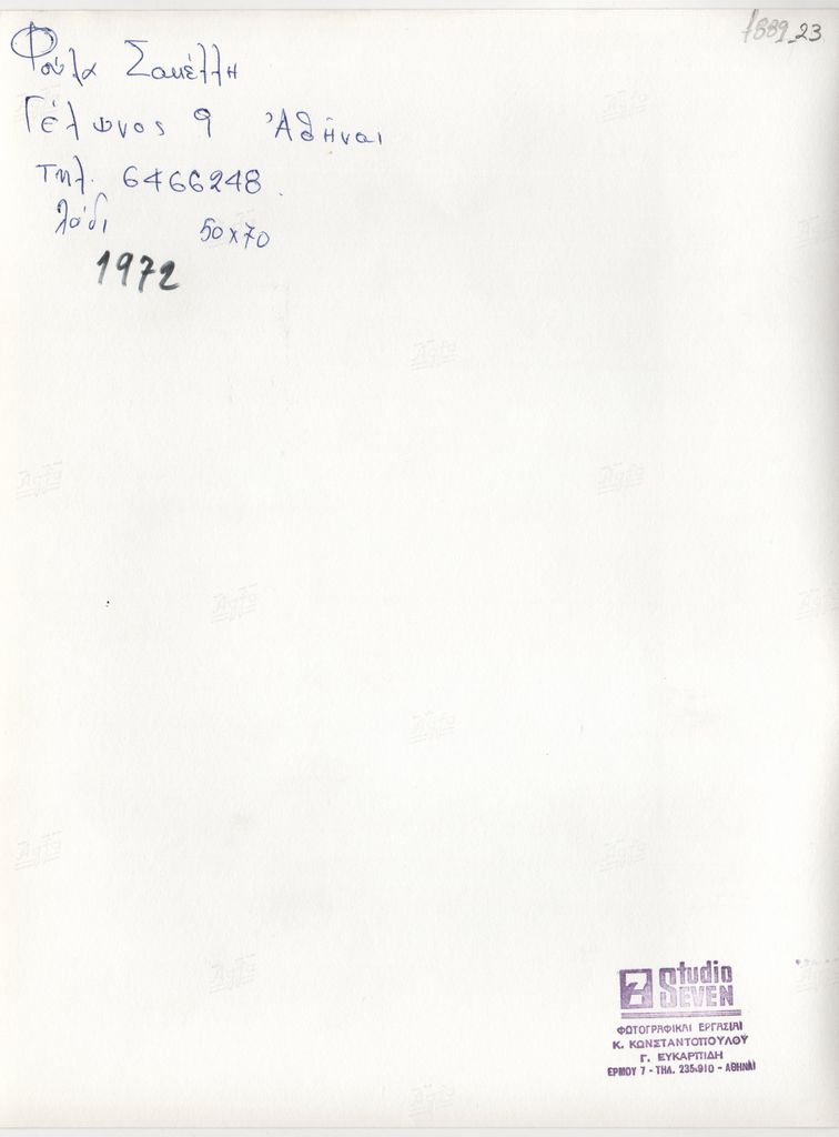 Φωτογραφία, α/μ, φωτογραφικό χαρτί, 24,0×18,0 εκ. Αναπαραγωγή έργου της Φούλας Σακέλλη. Στην πίσω όψη, επιγραφή και σφραγίδα του φωτογράφου Studio 7 Κ. Κωνσταντόπουλου Γ. Ευκαρπίδη.