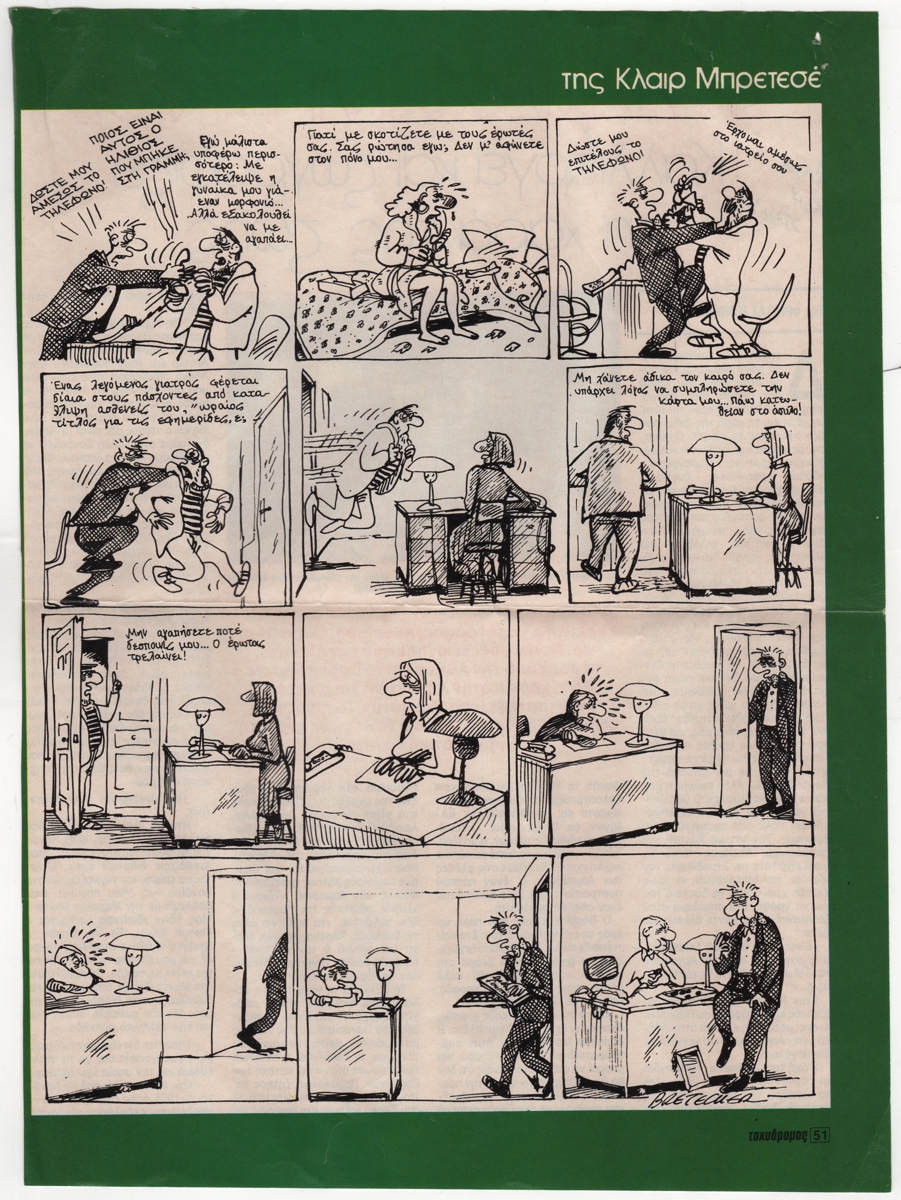 Απόκομμα, έντυπο, στα ελληνικά, ιλουστρασιόν χαρτί, 29,8×20,5 εκ. Σκίτσα της Claire Bretécher. Στην άλλη όψη συνέντευξη του ζωγράφου Βασίλη Λαμπρινού στην Φρίντα Μπιούμπι.