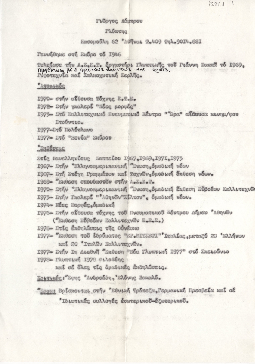 Κείμενο, δακτυλόγραφο, με χειρόγραφες συμπληρώσεις, στα ελληνικά, χαρτί, 29,5×21,2 εκ. Βιογραφικό σημείωμα του γλύπτη Γιώργου Λάμπρου οργανωμένο χρονολογικά. Δίνονται στοιχεία για τις σπουδές του και κατάλογος ατομικών και ομαδικών εκθέσεων.