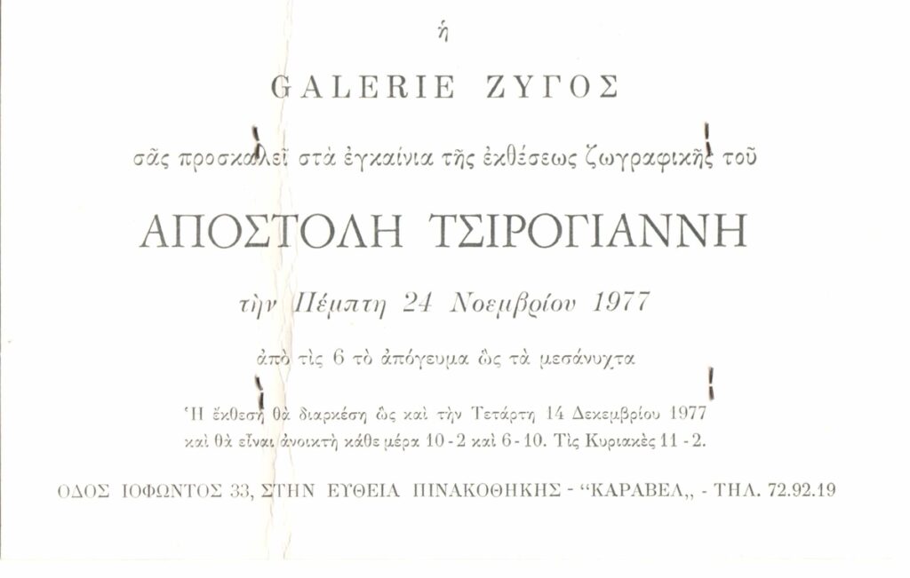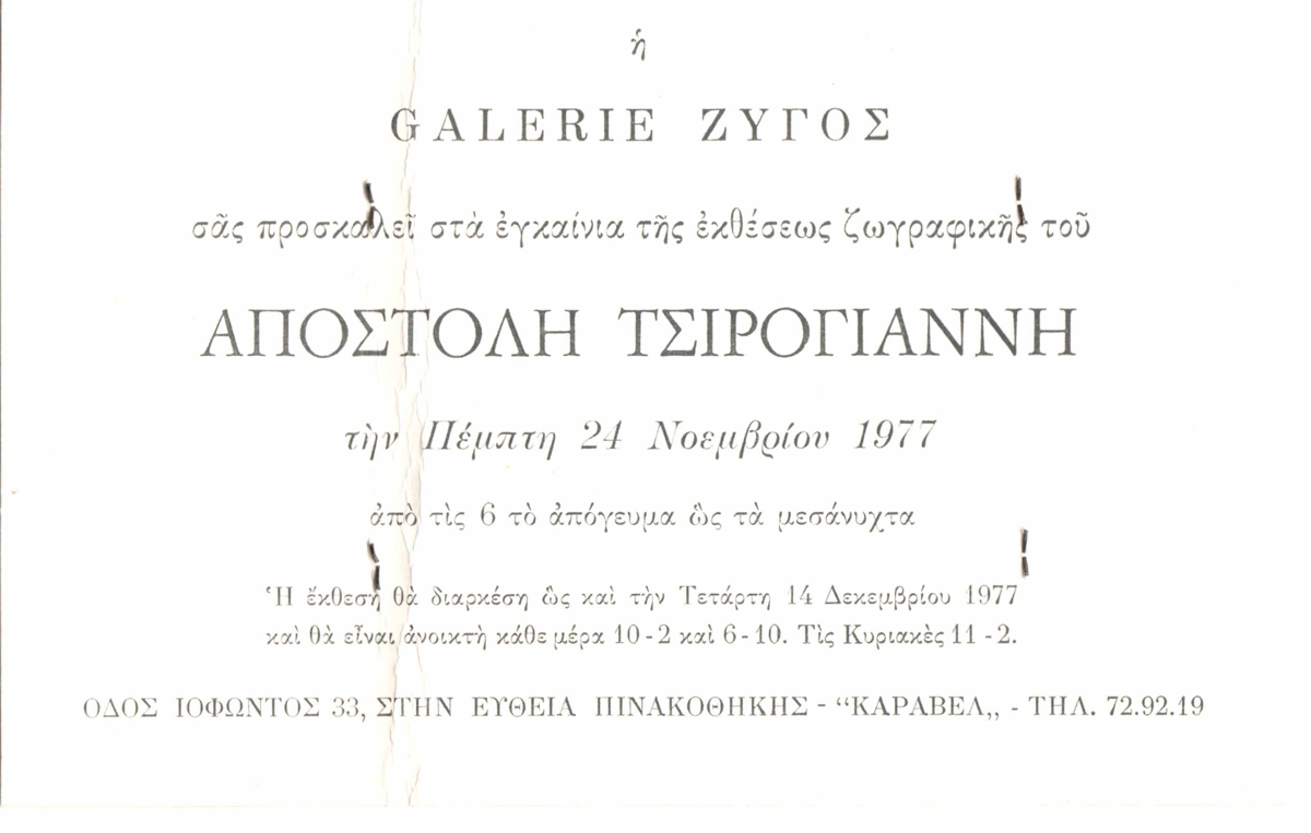 Πρόσκληση, χαρτί, 11,5×17,5 εκ., στα ελληνικά, εγκαινίων έκθεσης του Αποστόλη Τσιρογιάννη στην Galerie Ζυγός.