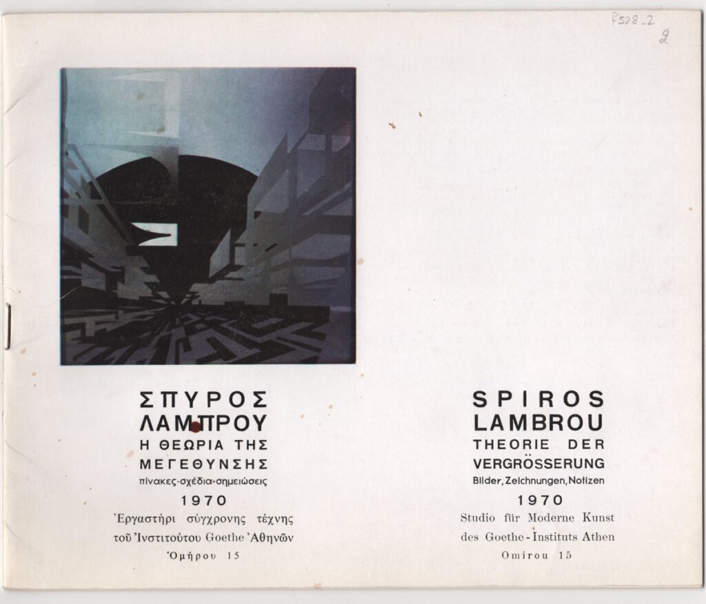 Έντυπο έκθεσης, στα ελληνικά και τα γερμανικά, χαρτί, 20,2×24,5 εκ. Το έντυπο αφορά την έκθεση του ζωγράφου Σπύρου Λάμπρου στην Αθήνα το 1970. Περιέχει βιογραφικό του καλλιτέχνη, κείμενο του Κ. Μεραναίου για το έργο του και κατάλογο έργων της έκθεσης. Εικονογραφείται με αναπαραγωγές έργων.