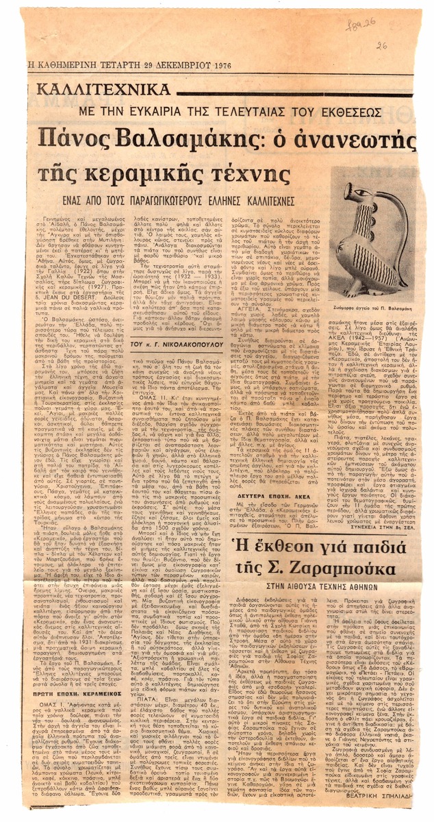 Απόκομμα της εφημερίδας “Η Καθημερινή” (29/12/1976) δημοσίευσης κριτικής για τον Πάνο Βαλσαμάκη και το έργο του με αφορμή πρόσφατη έκθεσή του.